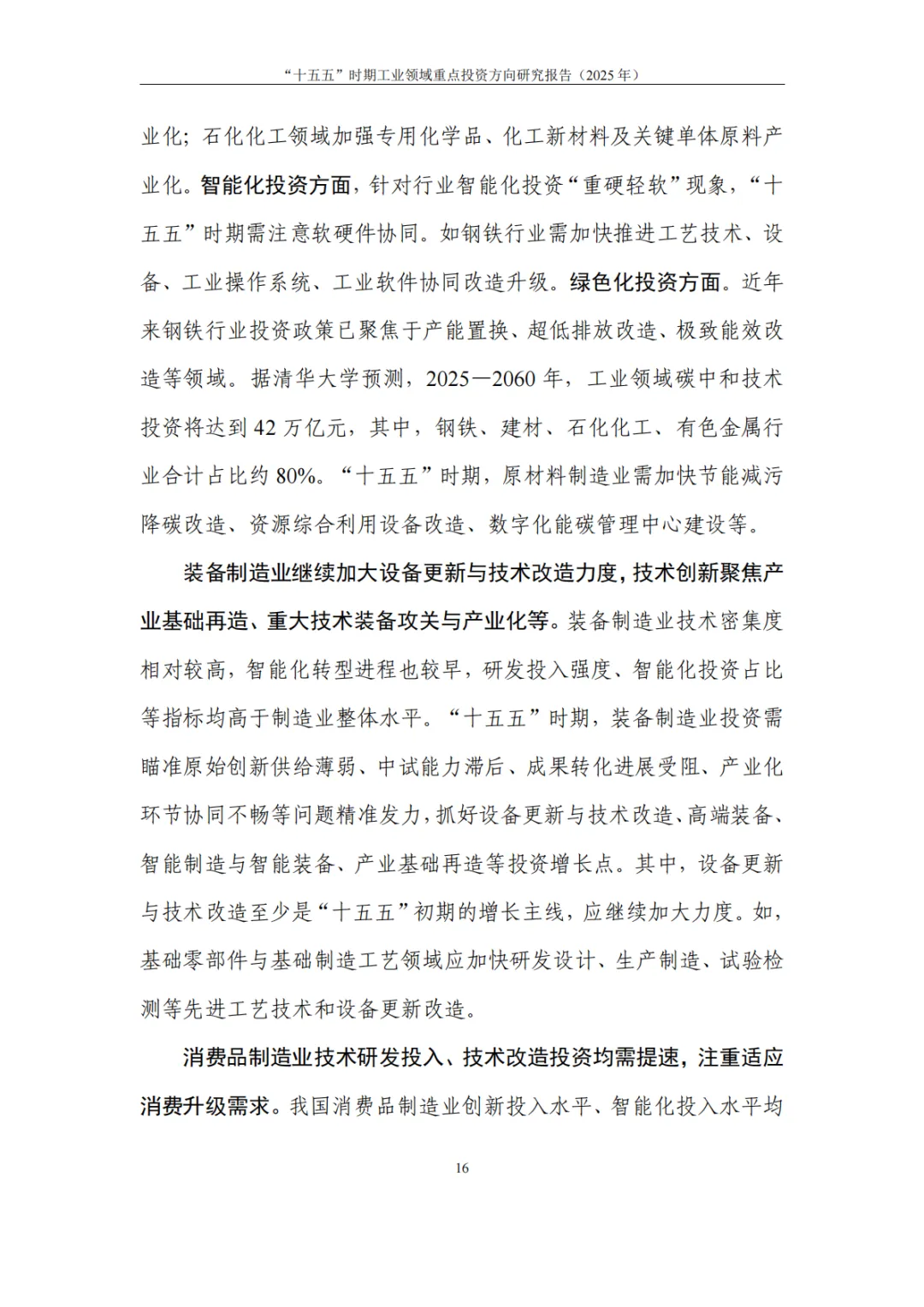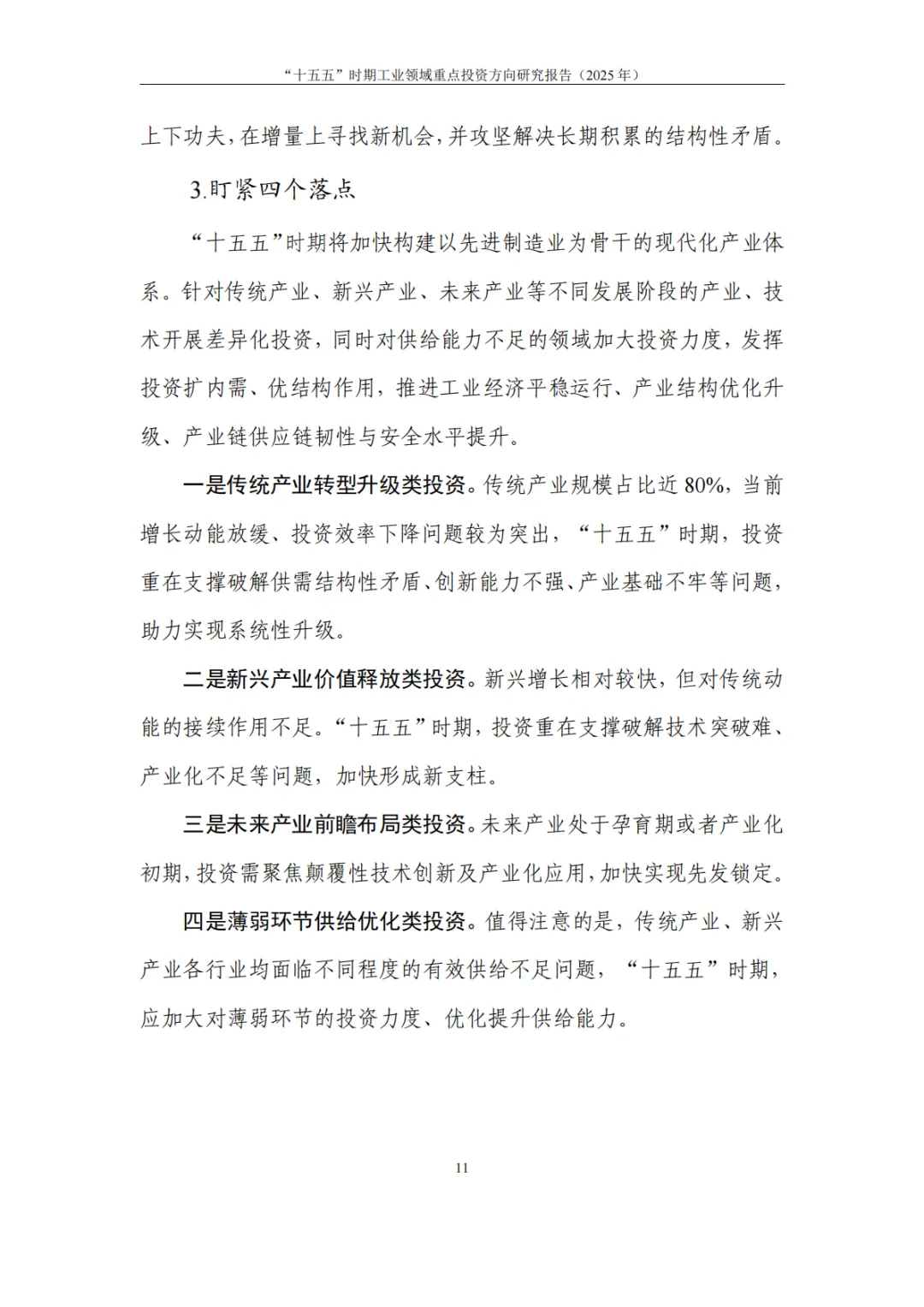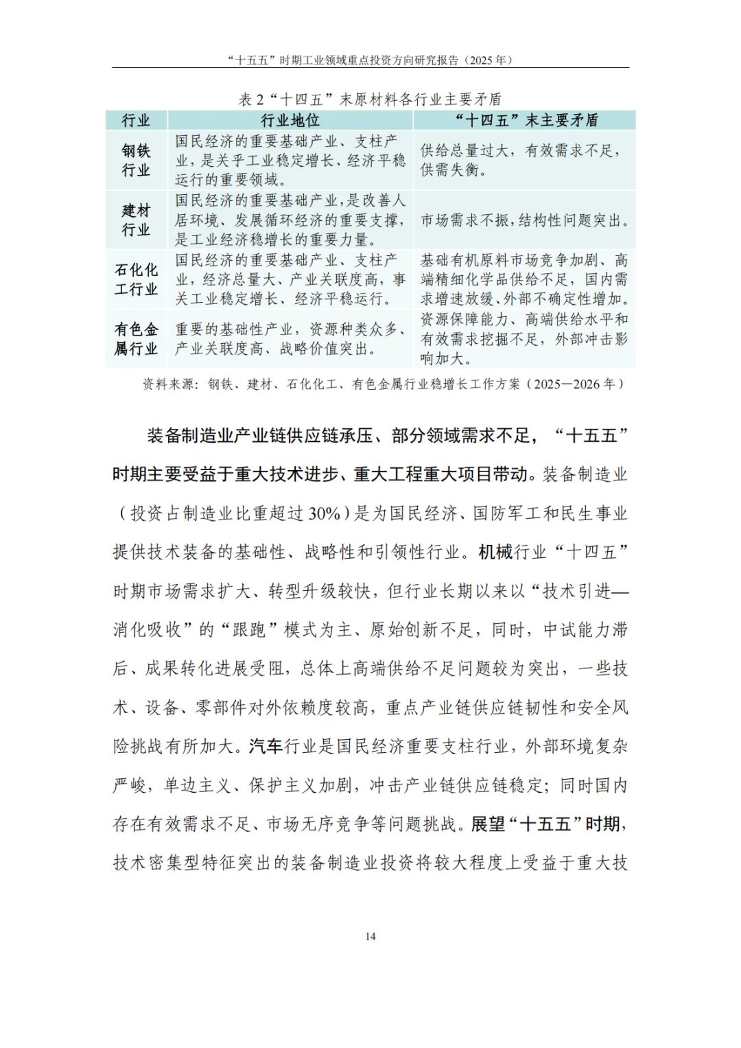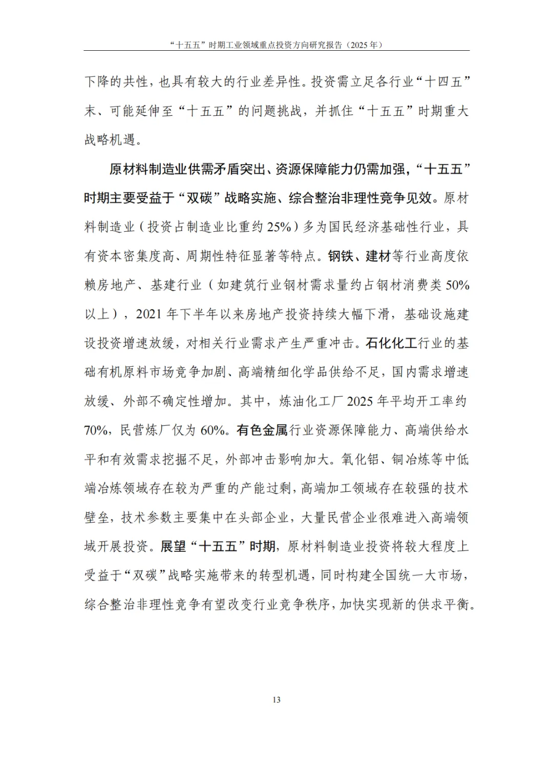 投资方向:“十五五”时期,传统产业投资瞄准高端化、智能化、绿色化、融合化方向,以技术创新和技术改造为抓手,因业施策提效率、促升级。如原材料行业亟需加快技术创新投入,在智能化投资方面注重软硬协同,绿色化投资方面继续带头发力。新兴产业投资聚焦技术攻关和产业化应用,加快形成新支柱。未来产业投资瞄准颠覆性创新、前沿引领技术突破,贯穿“技术—产业”全周期,助力在大国科技产业竞争中实现先发锁定。此外,注重通过投资提升中间品等部分薄弱领域的有效供给能力。