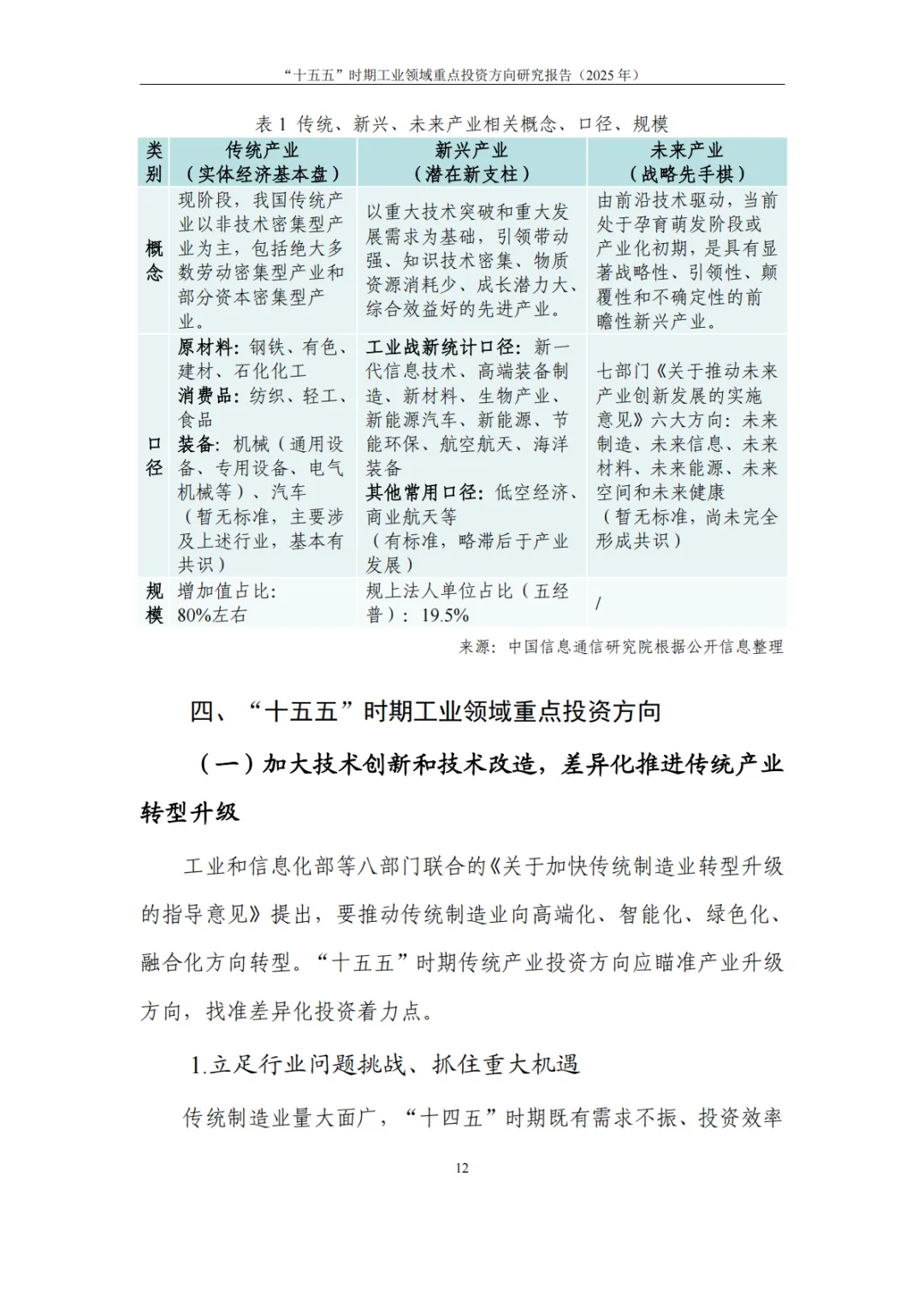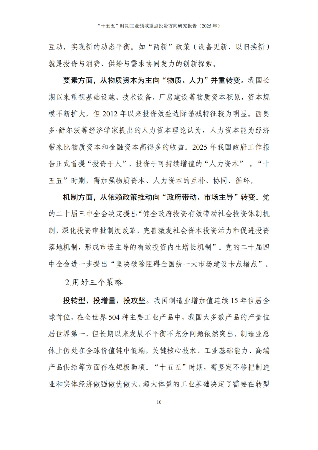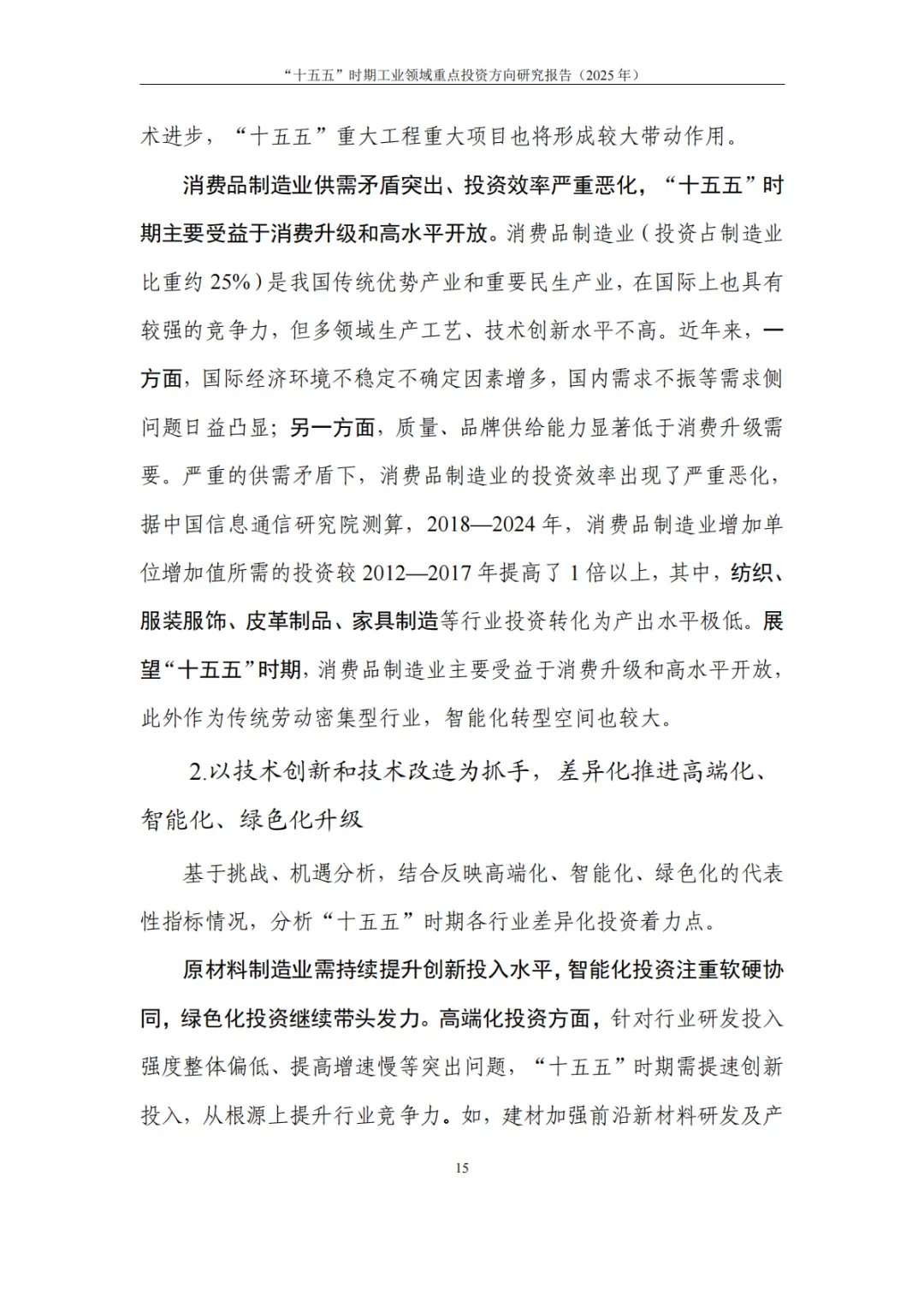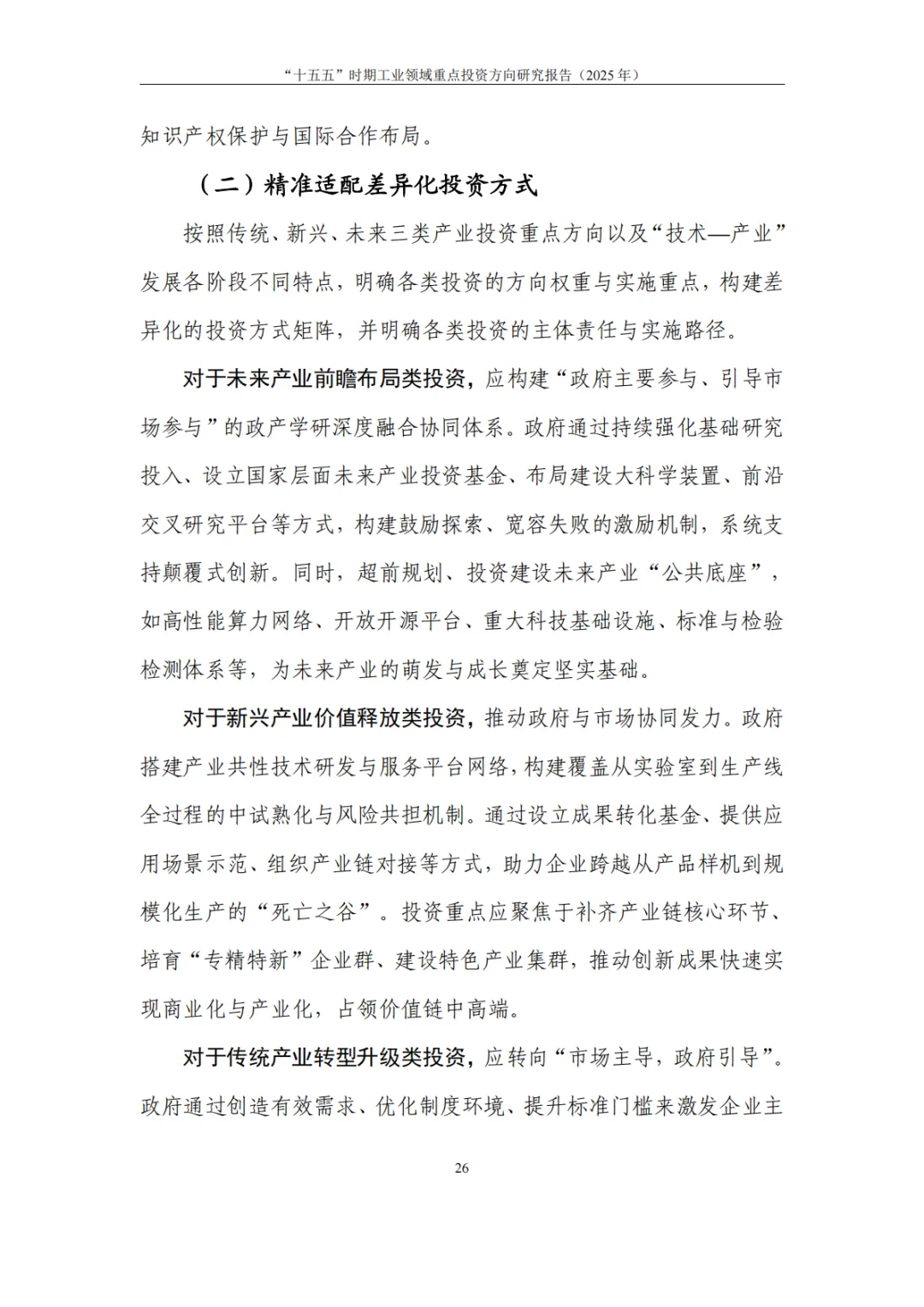 投资方向:“十五五”时期,传统产业投资瞄准高端化、智能化、绿色化、融合化方向,以技术创新和技术改造为抓手,因业施策提效率、促升级。如原材料行业亟需加快技术创新投入,在智能化投资方面注重软硬协同,绿色化投资方面继续带头发力。新兴产业投资聚焦技术攻关和产业化应用,加快形成新支柱。未来产业投资瞄准颠覆性创新、前沿引领技术突破,贯穿“技术—产业”全周期,助力在大国科技产业竞争中实现先发锁定。此外,注重通过投资提升中间品等部分薄弱领域的有效供给能力。