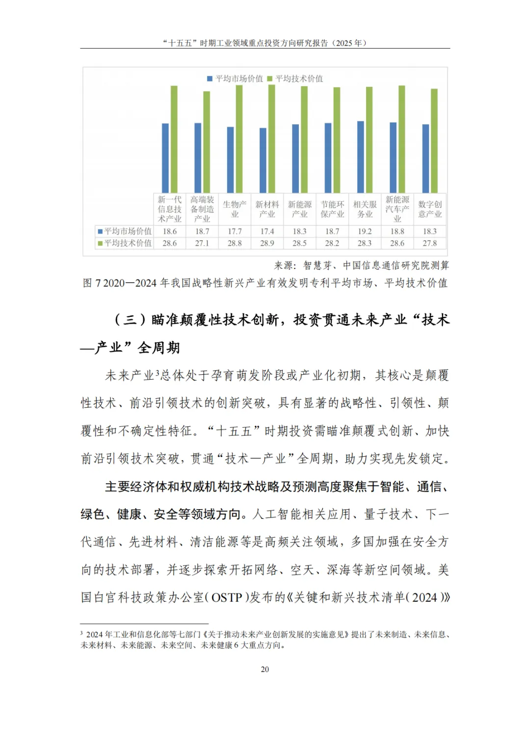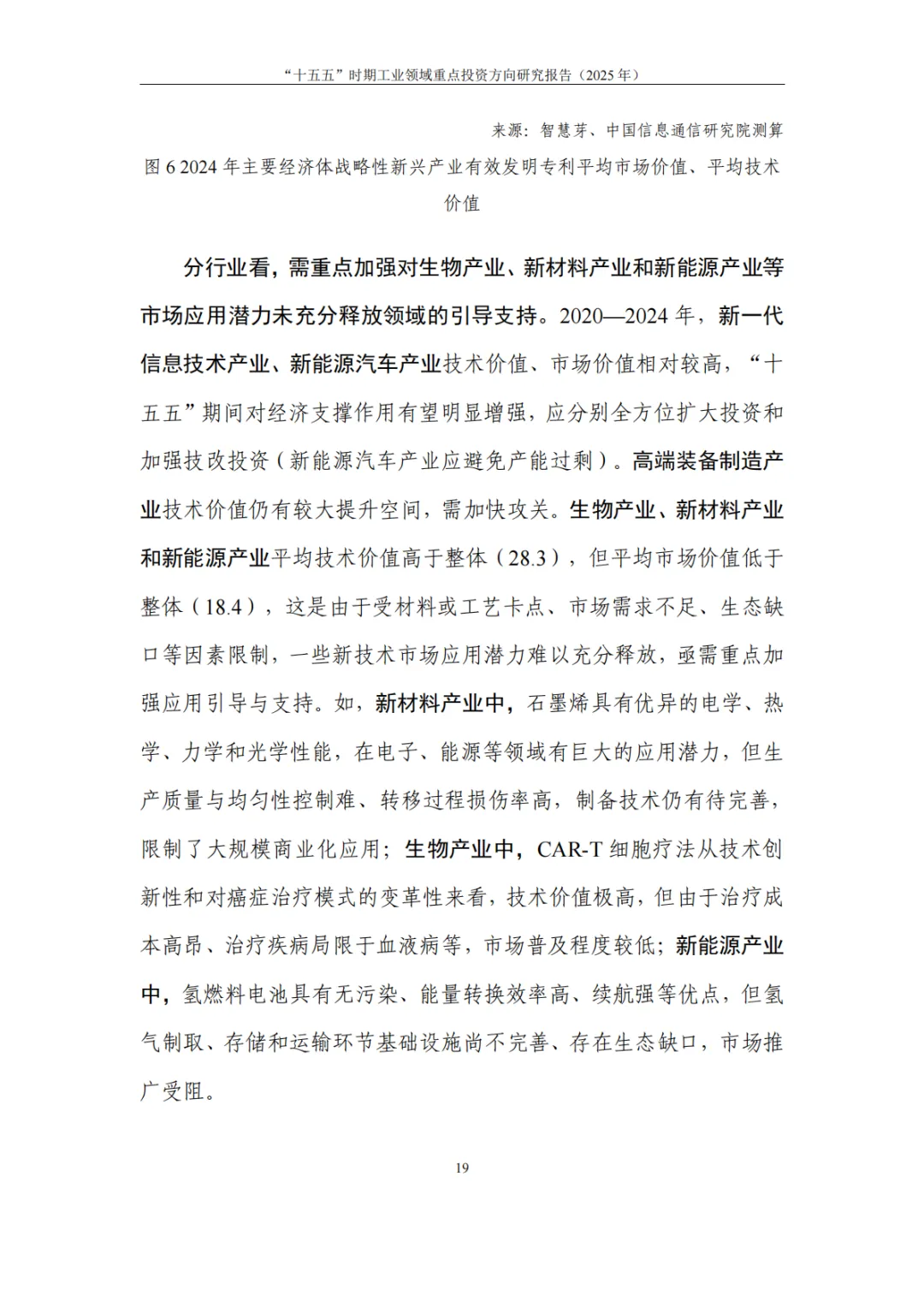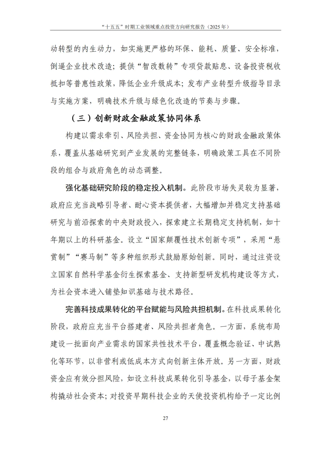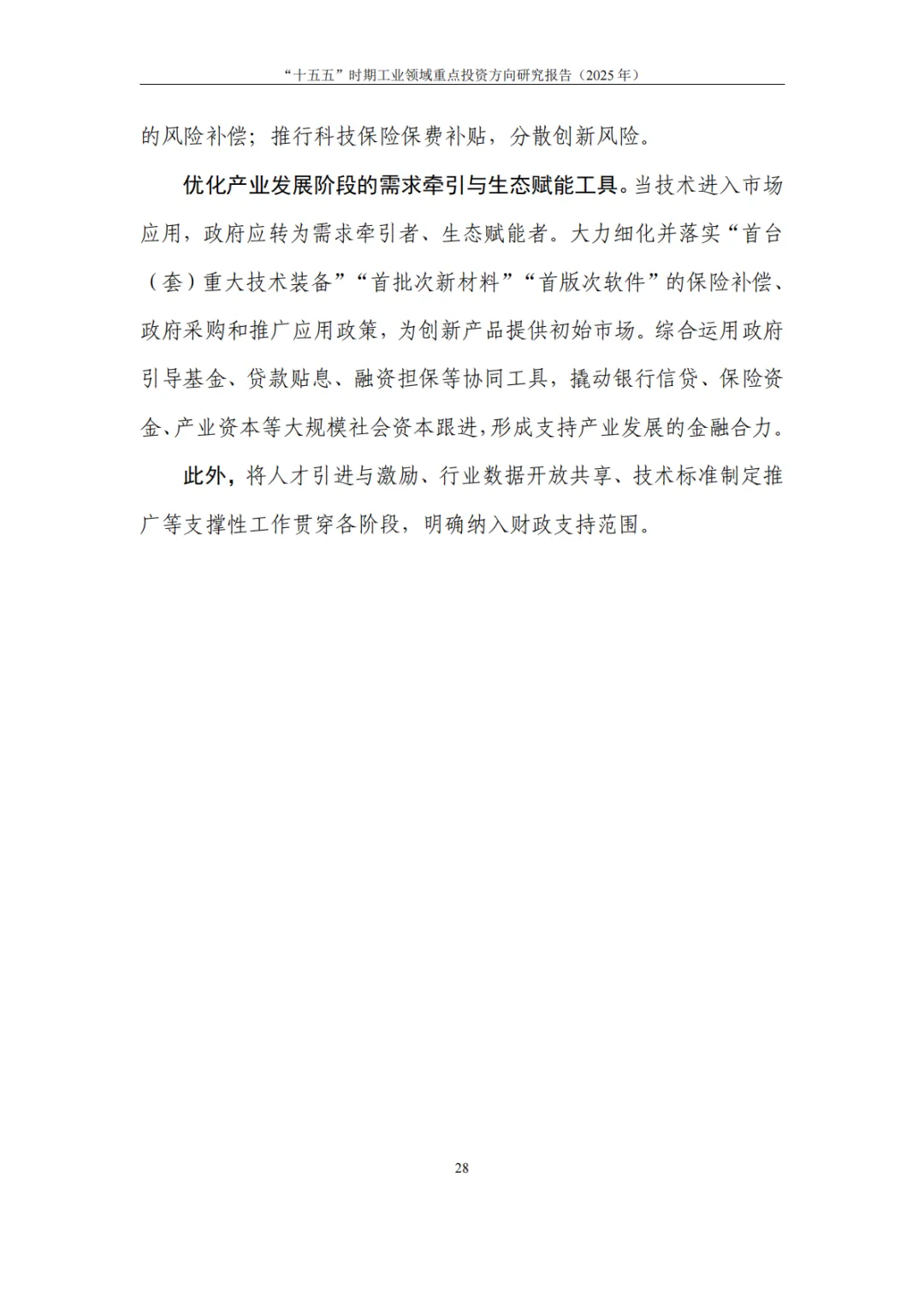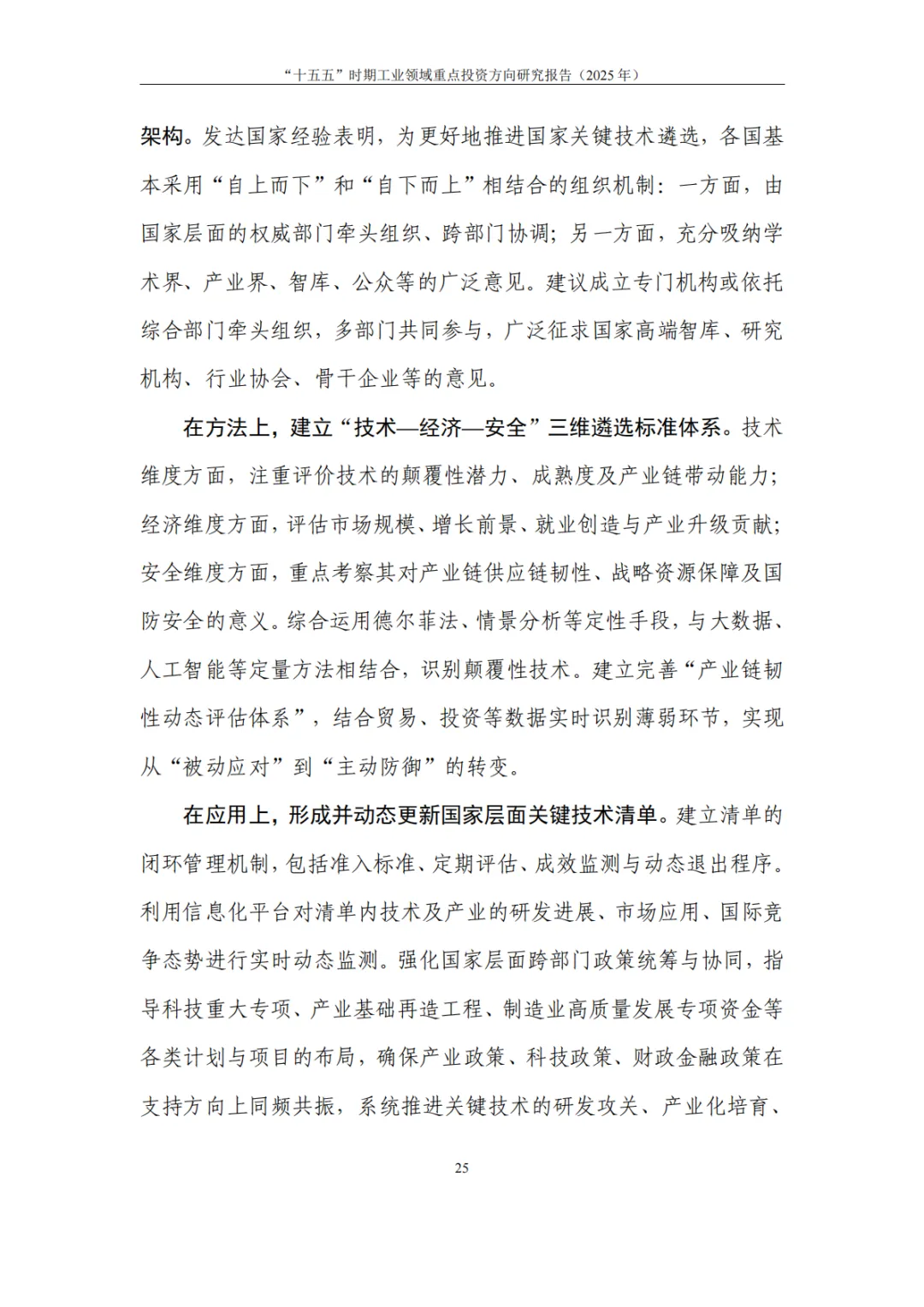 投资方向:“十五五”时期,传统产业投资瞄准高端化、智能化、绿色化、融合化方向,以技术创新和技术改造为抓手,因业施策提效率、促升级。如原材料行业亟需加快技术创新投入,在智能化投资方面注重软硬协同,绿色化投资方面继续带头发力。新兴产业投资聚焦技术攻关和产业化应用,加快形成新支柱。未来产业投资瞄准颠覆性创新、前沿引领技术突破,贯穿“技术—产业”全周期,助力在大国科技产业竞争中实现先发锁定。此外,注重通过投资提升中间品等部分薄弱领域的有效供给能力。