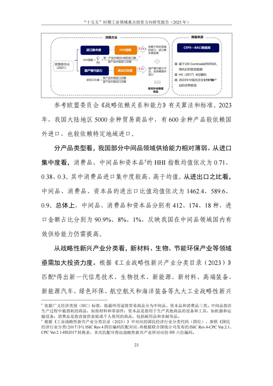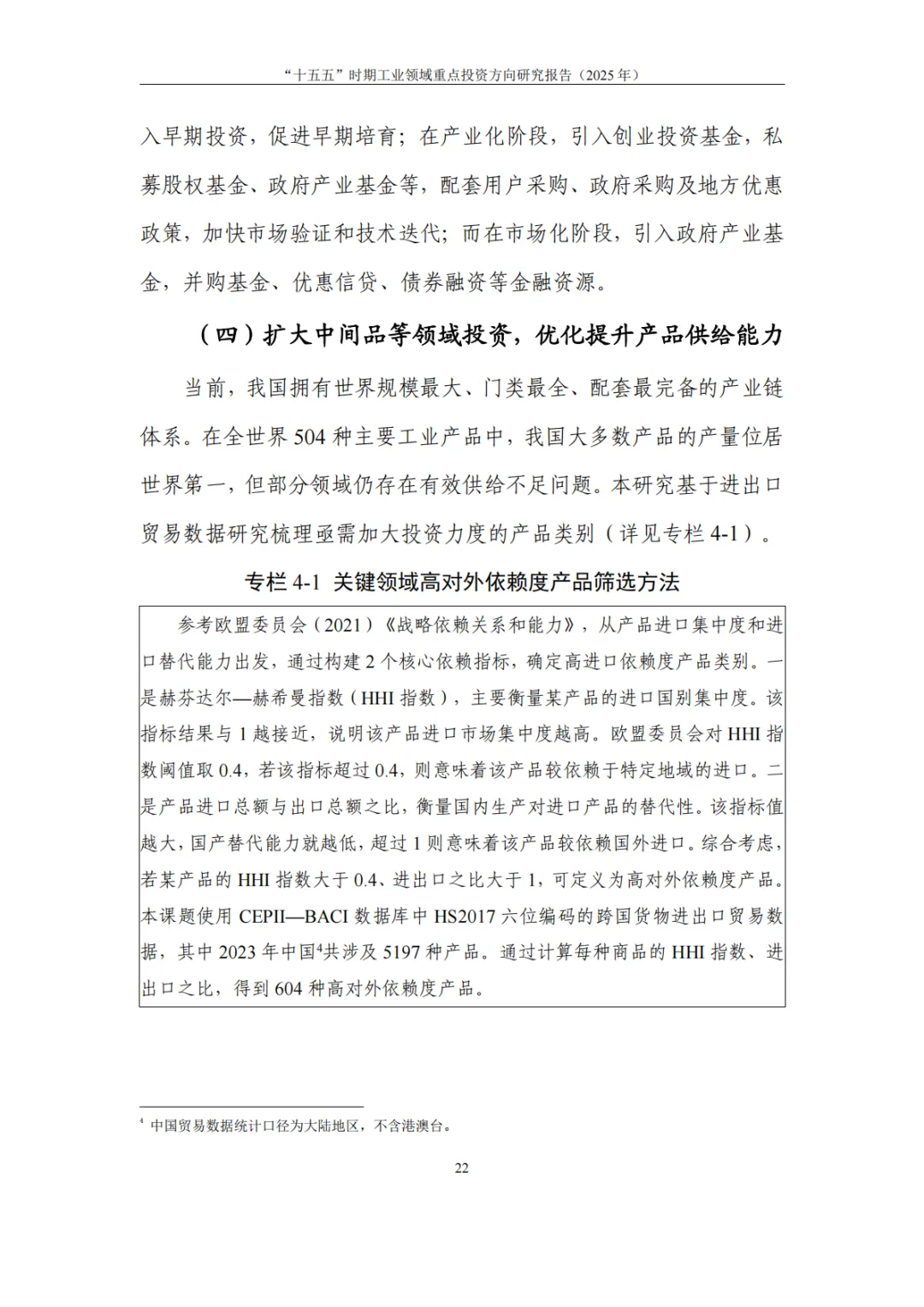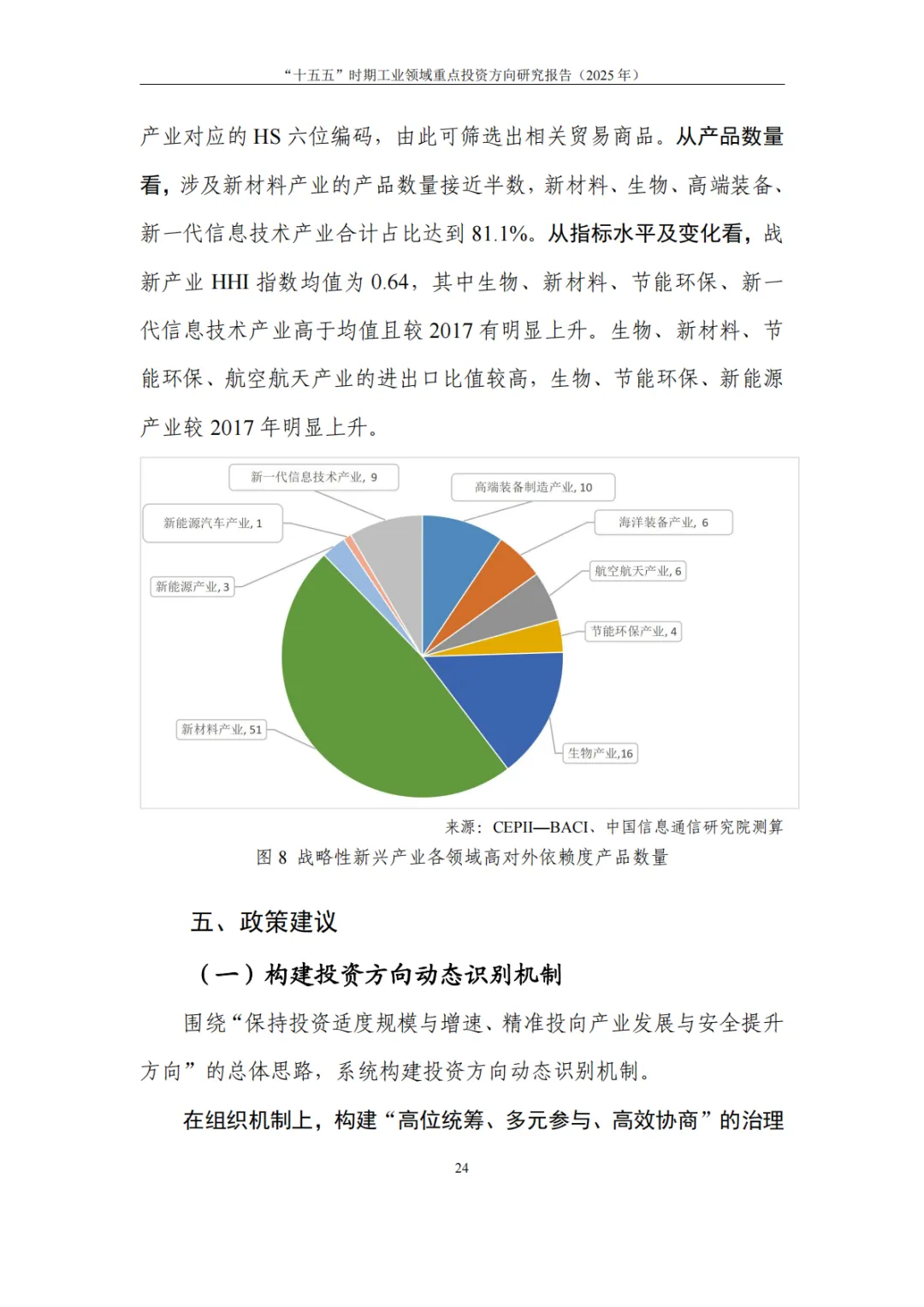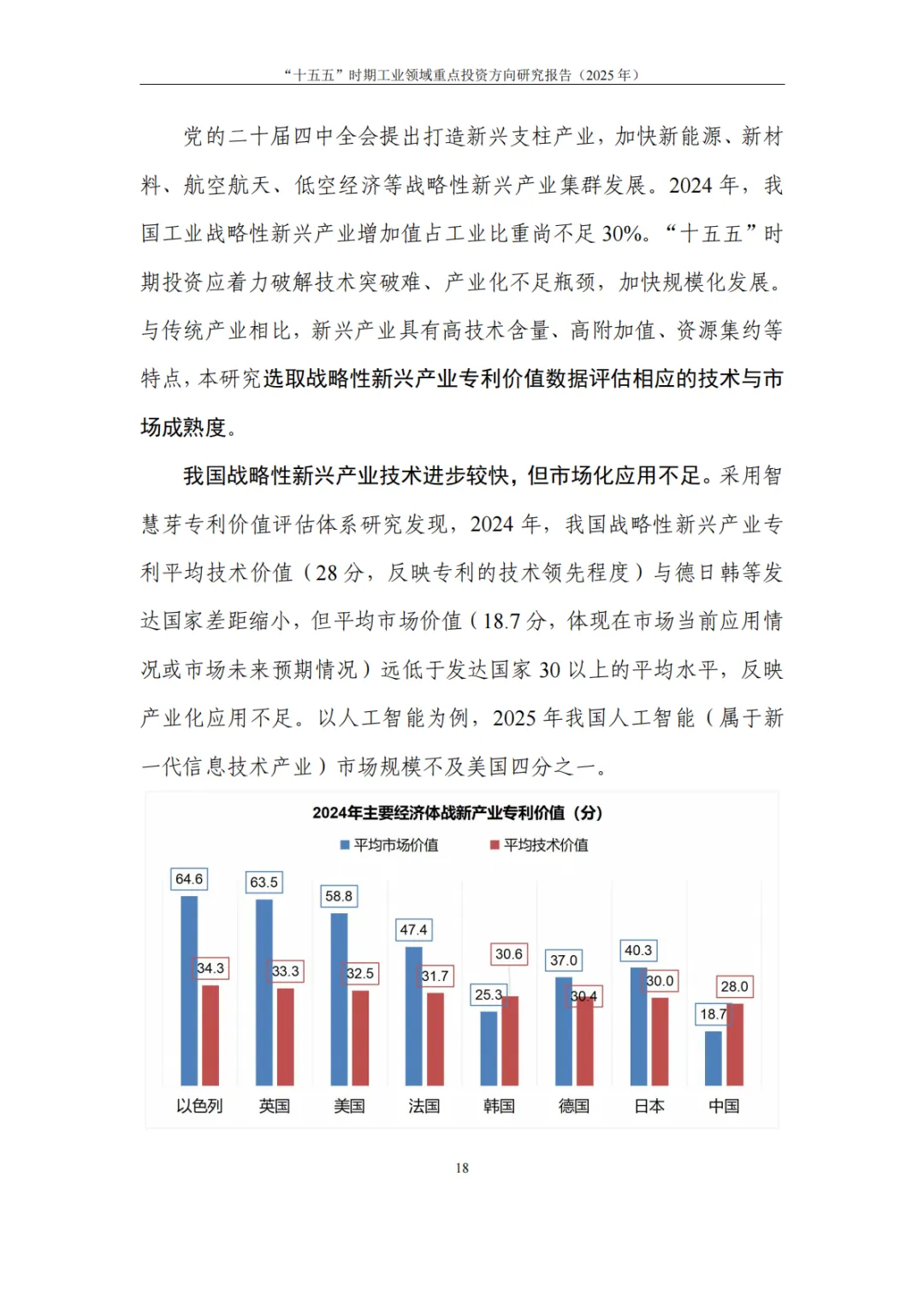 投资方向:“十五五”时期,传统产业投资瞄准高端化、智能化、绿色化、融合化方向,以技术创新和技术改造为抓手,因业施策提效率、促升级。如原材料行业亟需加快技术创新投入,在智能化投资方面注重软硬协同,绿色化投资方面继续带头发力。新兴产业投资聚焦技术攻关和产业化应用,加快形成新支柱。未来产业投资瞄准颠覆性创新、前沿引领技术突破,贯穿“技术—产业”全周期,助力在大国科技产业竞争中实现先发锁定。此外,注重通过投资提升中间品等部分薄弱领域的有效供给能力。