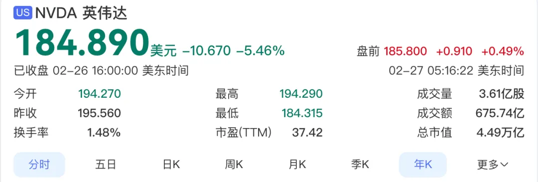 2月26日美股,英伟达股价大跌5.46%,市值缩水超2500亿美元至4.5万亿美元,其下跌直接引发芯片板块连锁反应:AMD跌3.41%、博通跌3.19%、台积电跌2.82%。