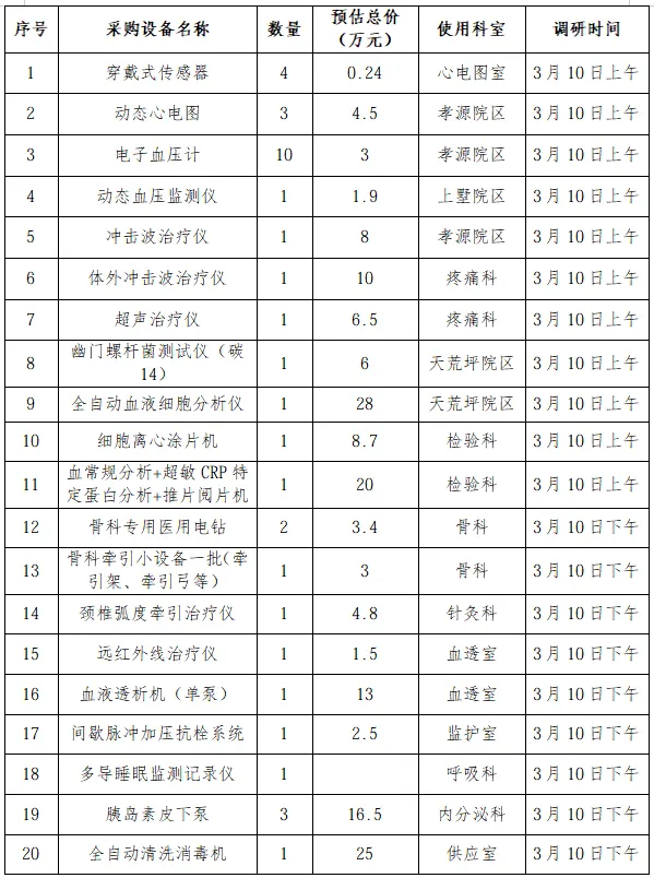 3.调研日期:编号1-11设备2026年3月10号(周二)上午8:30,编号12-20设备2026年3月10日(周二)下午13:30,调研地点:门诊四楼第一会议室;