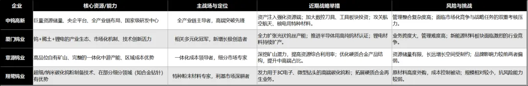 上游资源掌控者:这是一场“家里有矿”的终极游戏。全球钨资源分布高度不均,中国坐拥半壁江山。其中,中钨高新作为中国五矿旗下唯一的钨产业平台,通过托管集团内主力矿山,掌控着令人艳羡的资源底牌,其钨资源储量在国内处于绝对领先地位,扮演着“国家资源战略执行者”的角色。厦门钨业则是罕见的、成功打通了从矿山到终端合金刀具全产业链的多元化巨头,尤其在新能源材料领域(钨丝、钴锂材料)布局深远。章源钨业深耕江西资源腹地,以其拥有的高品位矿山构建了显著的成本护城河,是“精耕细作”的区域龙头典范。
