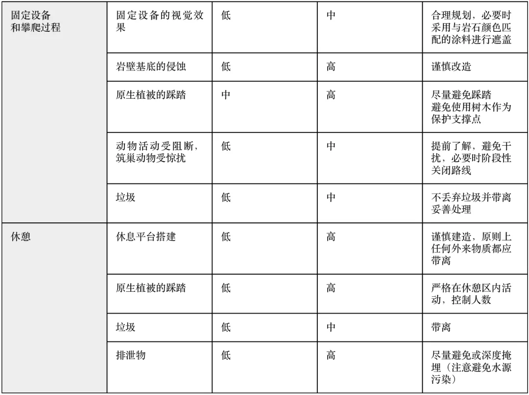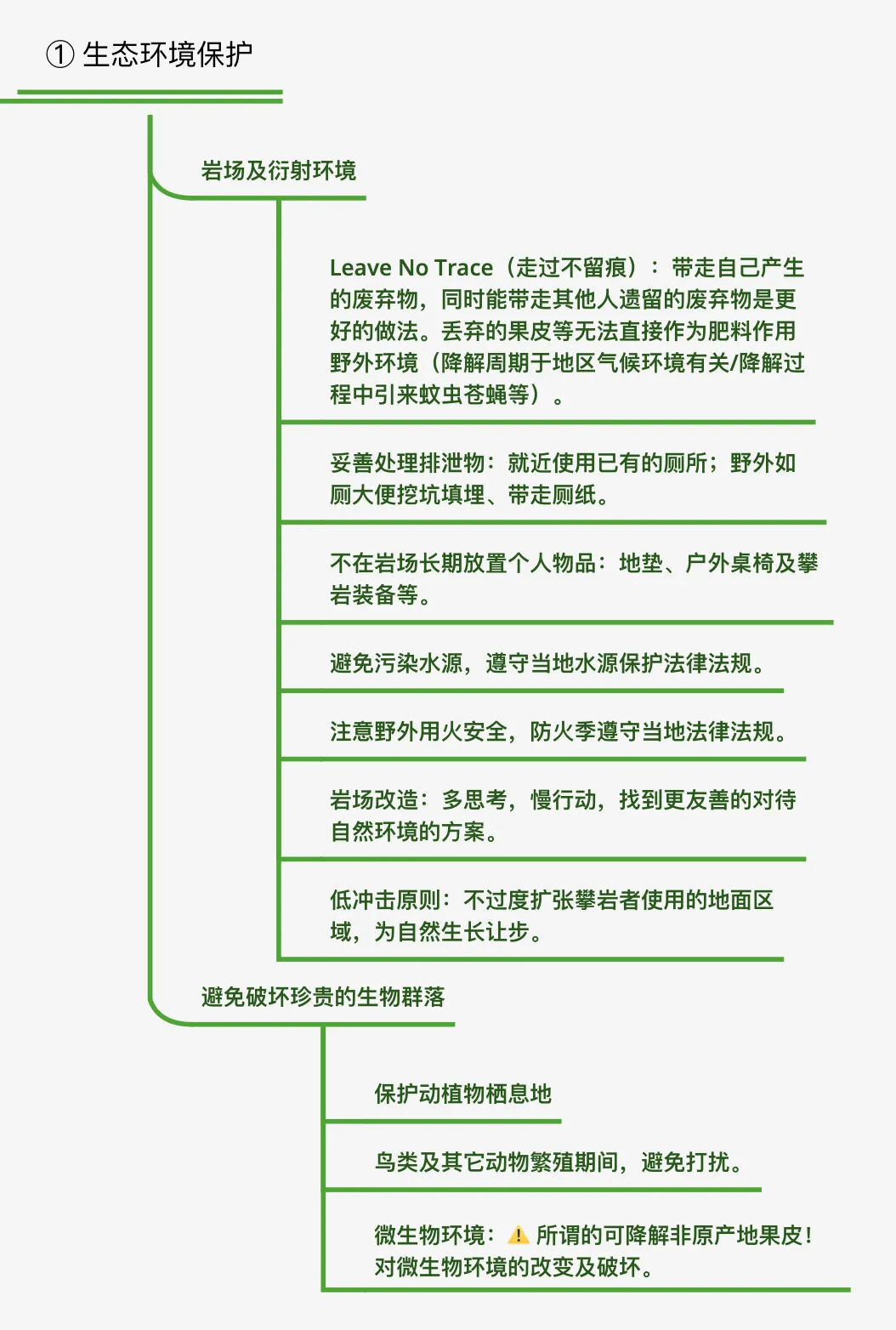 维护岩场及周边生态环境保护:LNT原则(走过不留痕)、废弃物、个人物品、排泄物、水源、用火安全、岩场改造、低冲击;