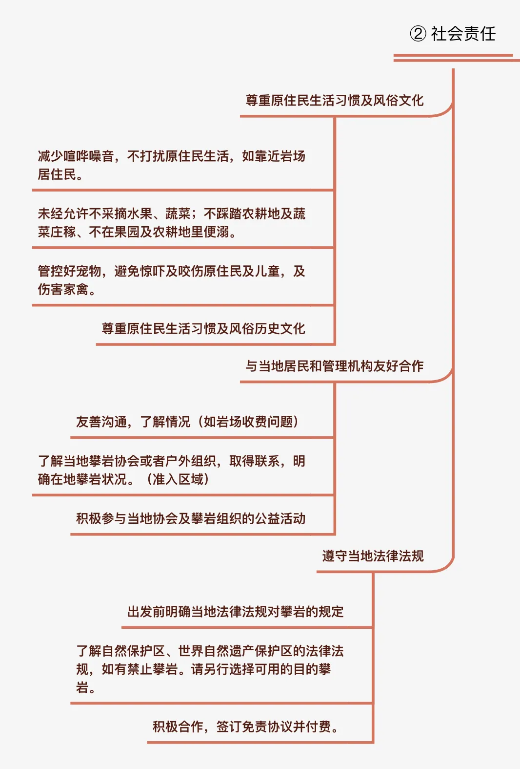 社会责任:尊重习惯、不打扰、不踩踏、管控宠物、友善沟通、了解许可、积极参与公益、了解法规、积极合作。