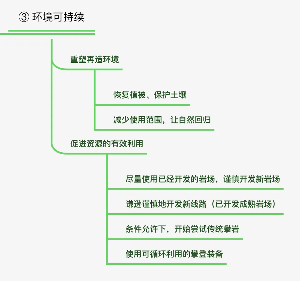 环境可持续:重塑再造环境、恢复植被、减少使用范围、让自然回归、谨慎新开发、传统攀岩、循环再用;