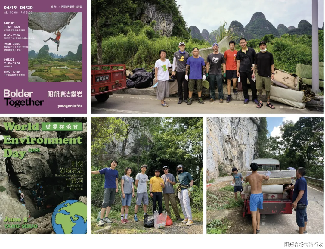 广西壮族自治区桂林市阳朔县的攀岩场地是国内最受关注的攀岩胜地,举办阳朔攀岩节及开展多样攀岩活动,每年来到阳朔攀岩的国内外游客数以万计,据新华网报道,阳朔共有70个独立岩场、1200余条精品攀登线路。随着攀岩人数的增多,岩场的生态在一定程度上因为攀岩者的频繁使用,产生了一定的环境冲击状况,例如,地面植被变化,垃圾和排泄物增多,动物栖息地变化等。造成这些状况的主要原因一是攀岩人数增多,二是攀岩过程中参与者对保护环境的关注度不够。同时,在阳朔岩场,也存在岩友与当地社区的沟通不当,让岩场周边的居民对攀岩活动产生了负面印象,甚至形成了冲突。攀岩群体对环境关注也是在变化的,2023年起,当地攀岩群体自发开展了多次环境整理的志愿行动,清理了岩场多年累积的垃圾和滞留废弃物品。
