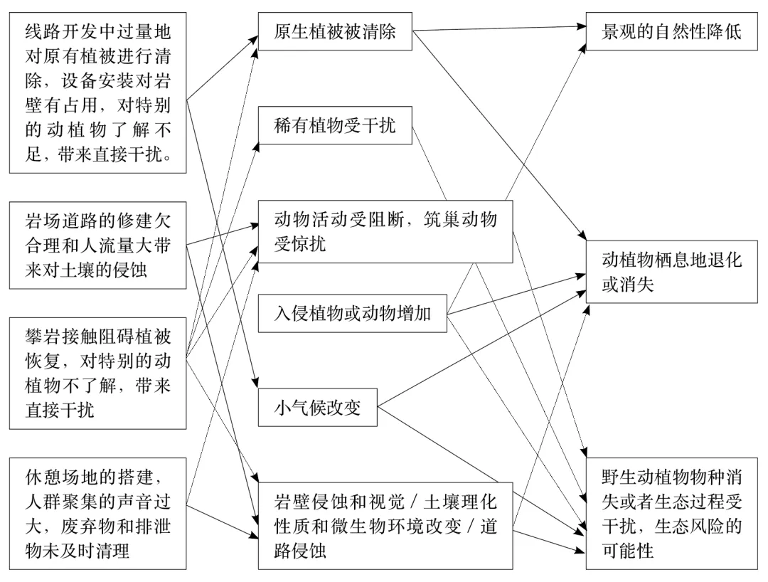 实地考察发现阳朔三处岩场的环境现状也各有特点:瑞士墙的人工建造设施较多,设有比较简约的标牌,设有订餐广告牌,设有雨棚和休息凳,岩壁下有水泥硬化地面,活动区域植物有较多陈旧的攀折的痕迹,有少量入侵植物;酒瓶山现在基本没有人工建造设施(之前有过,废弃后被清理),岩壁下没有硬化和铺装但土壤压实明显,有少量入侵植物;雷劈山岩壁下有碎石铺路,有新搭建的钢架木质休息平台,有大量入侵植物,活动区域的大树有很新的砍伐痕迹。三个岩场的环境现状和所受影响也有很多共同之处,经过访谈和现场观察归纳如下: