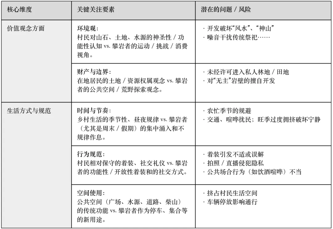 不同群体(攀岩者 vs. 在地居民)在价值观、规范、行为方式、空间使用、环境观念等方面的差异,可能产生的误解和潜在摩擦。