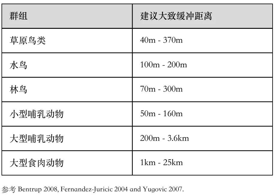 ·据研究报道,各类野生动物种群所需要大致缓冲距离如下: