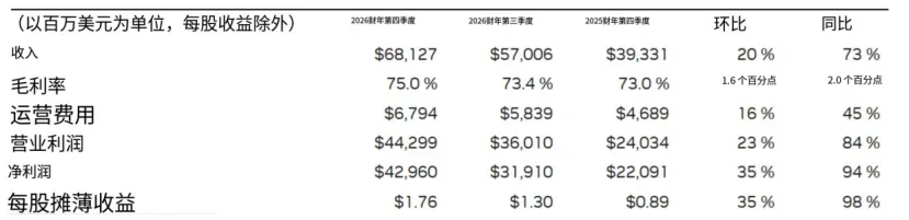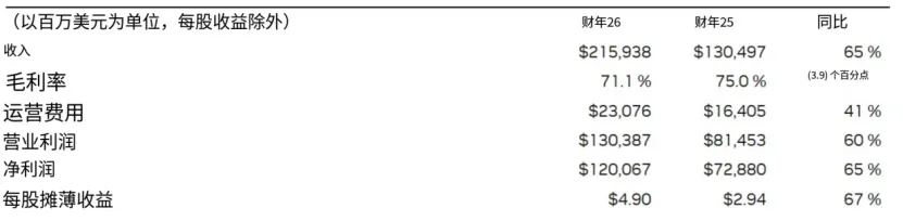 从全年表现看,2026财年总营收达2159亿美元,同比增长65%;净利润1200亿美元,同比增长67%。