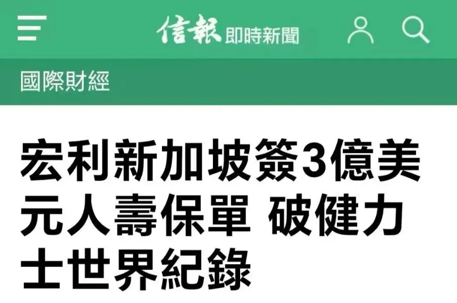 近日,宏利新加坡签约了一份3亿美元(约合人民币20.57亿元)的人寿保单,打破世界吉尼斯纪录。此前的纪录由汇丰人寿于2024年在香港创下,当时的保单金额为2.5亿美元。