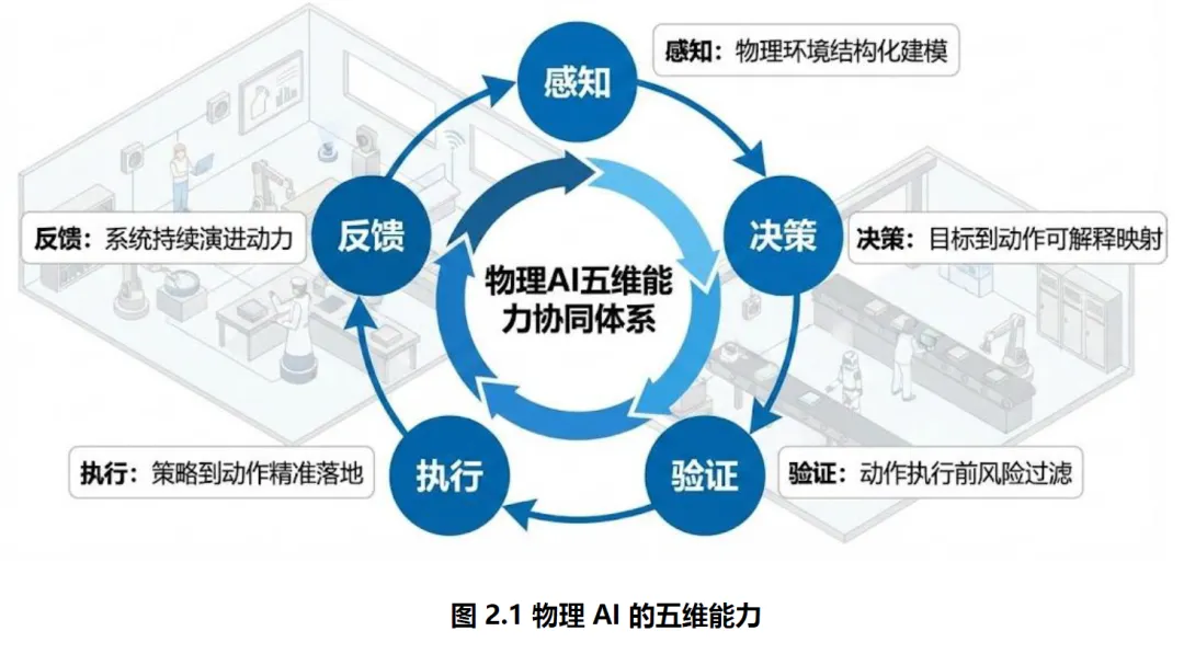 物理 AI 的系统能力,由 “感知、决策、验证、执行、反馈” 五大核心能力模块协同构建而成,五大模块既具备独立的技术体系与评价标准,又在功能与数据流上深度耦合,共同构成一条可工程化实现、可系统测试、可持续迭代的完整技术链路,同时形成了多回路耦合的协同体系。
