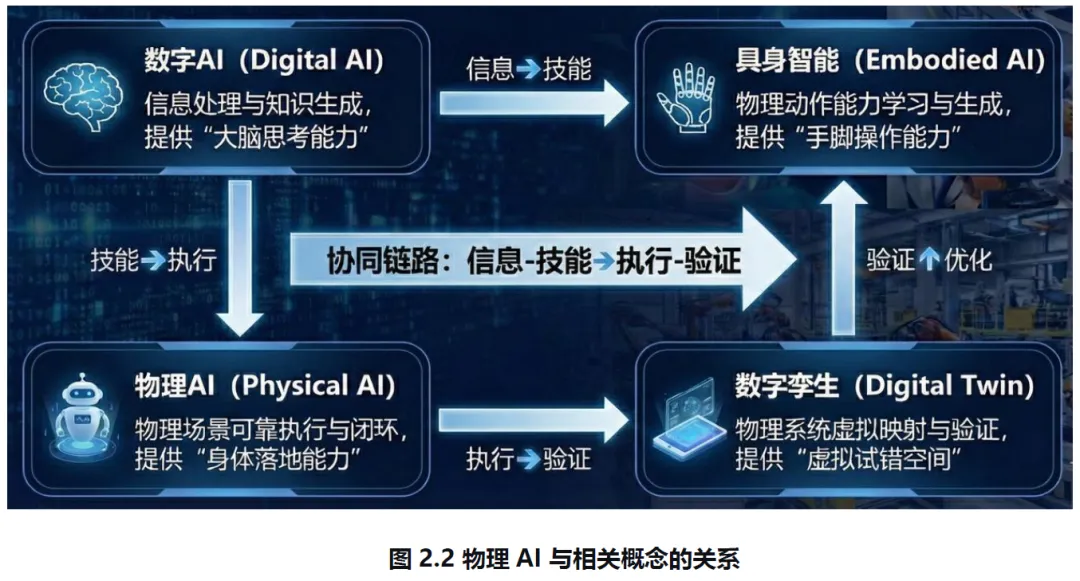 数字 AI 聚焦于信息域的数据处理与知识生成,本质是基于数据驱动的模式识别与逻辑推理,核心价值是提升信息处理效率,为物理 AI 提供 “大脑思考能力”;具身智能是 “智能依赖身体与环境交互” 的理论范式,核心是实现智能体与物理世界的动作交互,形成可泛化的操作技能,为物理 AI 提供 “手脚操作能力”;物理 AI 以物理场景中的可靠执行与系统闭环为核心目标,通过硬件、算法与工程的深度集成,构建可验证、可部署、可长期稳定运行的智能系统,为智能技术提供 “身体落地能力”;数字孪生侧重于构建物理系统的动态虚拟镜像与验证环境,核心价值是实现虚实协同的预测与决策,为物理 AI 提供 “虚拟试错空间”。