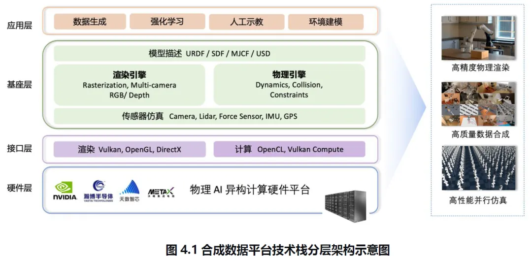 成熟的 “渲染 + AI” 合成数据平台采用分层模块化架构,从下到上分为硬件层、接口层、基座层、应用层四大层级,实现了从硬件到应用的全栈协同优化与闭环智能。同时,前沿合成数据生成技术持续突破,基于世界模型的物理仿真数据生成技术显著提升了数据的物理一致性准确率,自适应域随机化算法则大幅提升了合成数据的多样性,有效解决了模型在真实场景中的泛化难题。