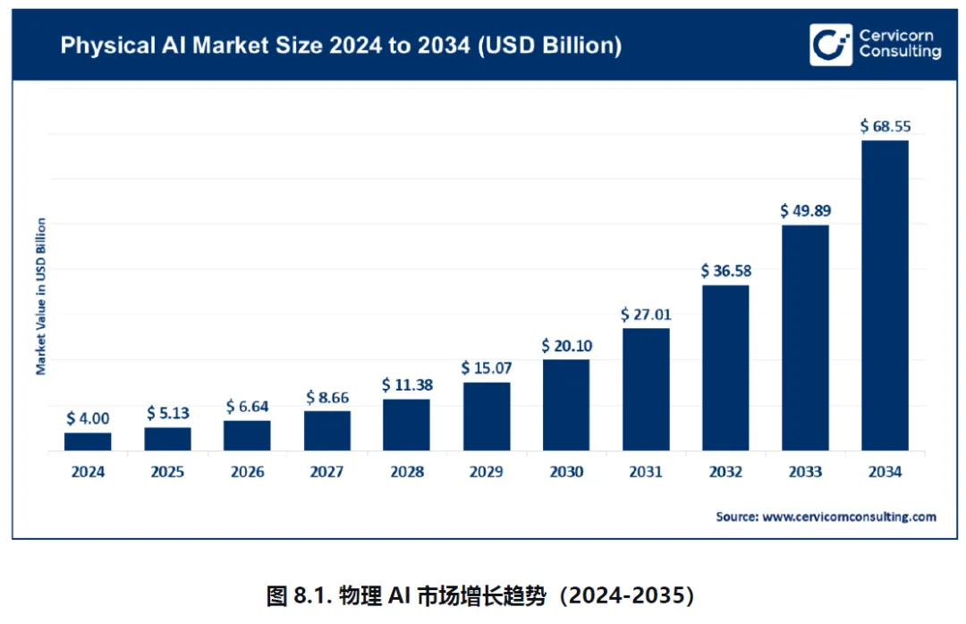 物理 AI 的兴起不仅是一项技术突破,更将催生全新的产业生态和竞争范式。全球物理 AI 市场正迎来关键发展拐点,预计将以 33.49% 的年复合增长率持续高速扩张,2025 年全球市场规模已达 51.3 亿美元,至 2034 年有望突破 685 亿美元。随着技术复杂度提升和应用场景深化,传统的垂直一体化研发模式难以持续,专业化分工与生态协同成为必然趋势,产业竞争焦点也从硬件本体转向软件、数据及生态系统。