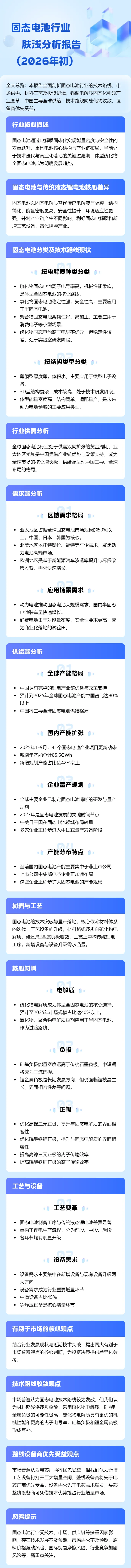 报告摘要:本报告以固态电池行业核心投资要点为蓝本,结合截至2026年初的近期行业动态、企业进展及市场数据,剖析固态电池行业的技术路线、市场供需、材料工艺、投资逻辑及风险因素,模糊呈现行业发展现状与未来趋势,为从业者提供局限、肤浅、片面的行业参考。