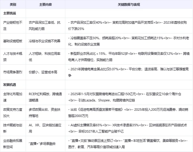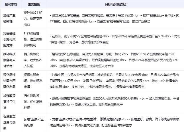 深化区域协同与国际化布局:打造中国—东盟农业合作示范区,依托东博会平台,推动横州茉莉花、百色芒果进入RCEP市场,目标是到2027年农产品出口额突破200亿元。推动"飞地经济"合作,借鉴广东经验,引入粤港澳大湾区企业共建加工园区(如与深圳合作建设茉莉花化妆品生产线)。在RCEP框架下,深化与东盟国家的电商合作,推动10个桂海商坊海外合作项目落地东盟,发布中(国)老(挝)、中(国)越(南)电商职业标准、中(国)泰(国)跨境电商课程标准,推进中国—东盟直播电商合作。