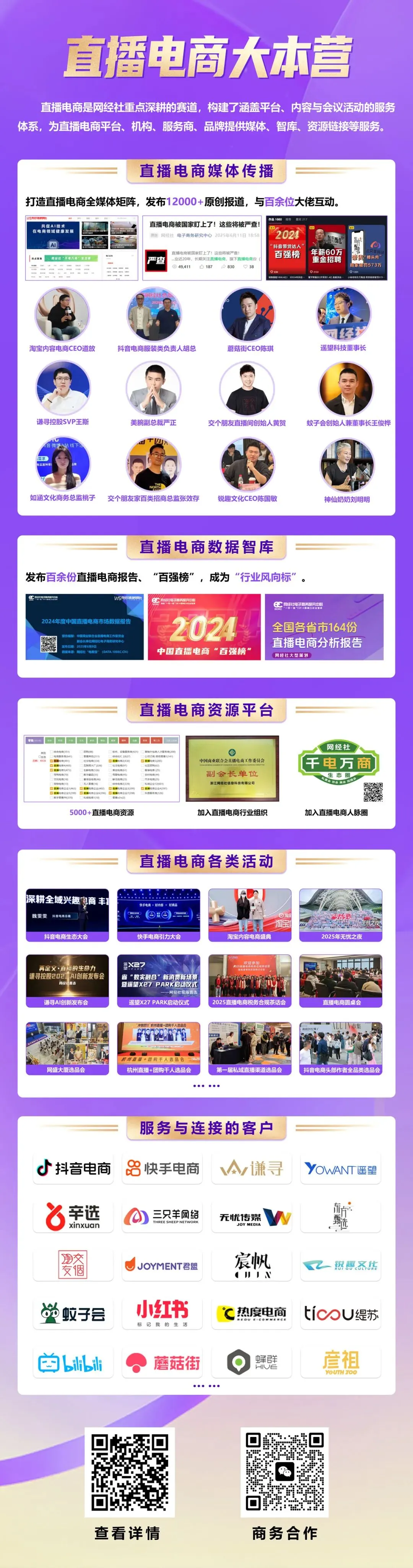 网经社深耕数字经济行业18年,长期关注直播电商,旗下直播电商台(DR.100EC.CN)重点报道、研究与服务的有:1.平台类:淘宝直播、多多直播、京东直播、抖音电商、快手电商、苏宁直播、蘑菇街直播、唯品会直播、小红书直播、哔哩哔哩、视频号;2.MCN类:谦寻文化、美腕、辛有志严选、遥望、交个朋友、无忧传媒、东方甄选、与辉同行、如涵、泰洋川禾、蜂群文化、大禹网络、青藤文化、宸帆、嘻柚互娱、构美、快美、古麦嘉禾、二咖传媒、热度电商、集淘、洋葱视频、侵尘文化、乾派文化、仙梓文化、缇苏、彦祖文化、君盟、白兔控股、愿景未来、优蜜、全尚文化、锐趣文化、三只羊网络、奇东传媒、麦芽传媒、奇光传媒;3.服务商类:有赞、微盟、魔筷科技、蚊子会、小鹅通、商派、大商创、红呗、米络星传媒、众灿互动、银河众星、巨鲸帮帮、云犀直播、影行天下、索象、微赞直播、微吼直播、有播、优大人、蝉妈妈、飞瓜数据;4.电商主播类:李佳琦、蛋蛋、辛巴、罗永浩、董宇辉、时大漂亮、广东夫妇、疯狂小杨哥、太原老葛、蜜蜂惊喜社、香菇来了、贾乃亮、董先生、陈洁kiki、烈儿宝贝、刘媛媛、高芋芋、多余和毛毛姐、小小101、麦小登、老吴很帅、陈三废姐弟、国岳、彩虹夫妇、黄宥明、骆王宇、郝劭文、李宣卓、董洁;5.生活服务电商类:美团 携程。