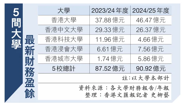香港五所顶尖高校——香港大学、香港中文大学、香港科技大学、香港城市大学及香港浸会大学,陆续披露2024/2025年度财务报告。一组亮眼数据惊艳全网:五校合计盈余逾90亿港币,较上一学年再添3.4亿进账,盈利势头持续攀升。