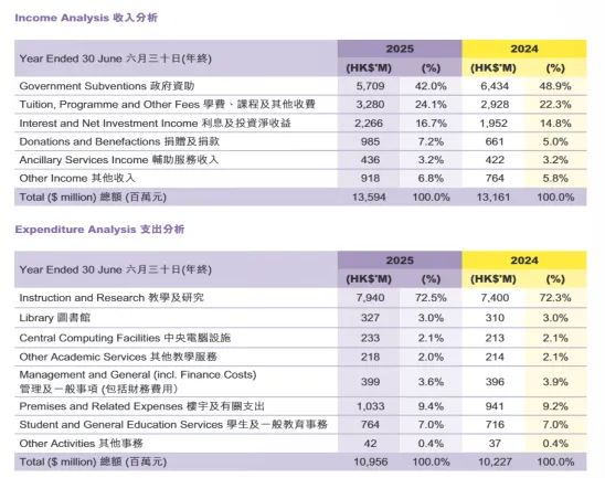 尽管今年港校陆续退还部分政府拨款,但政府资助依旧是港校财政的“定海神针”。根据香港政府2025至2026年度财政预算案,未来三年将向资助高校累计拨款681亿港币,年均拨款规模达220-230亿港币。即便每年按规定节省2%拨款,整体资助力度依旧雄厚,为港校的稳定发展筑牢根基。