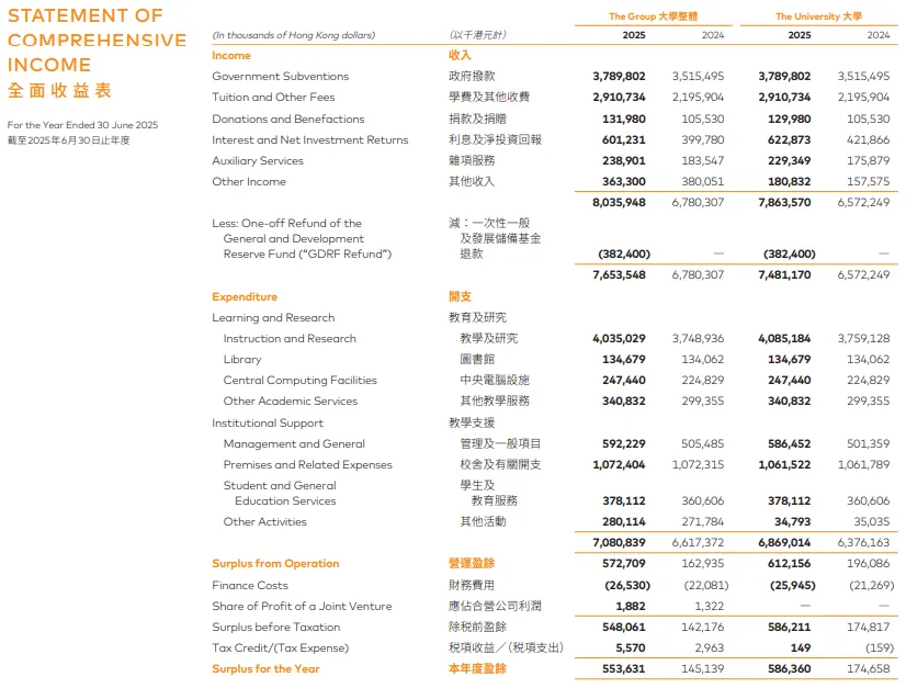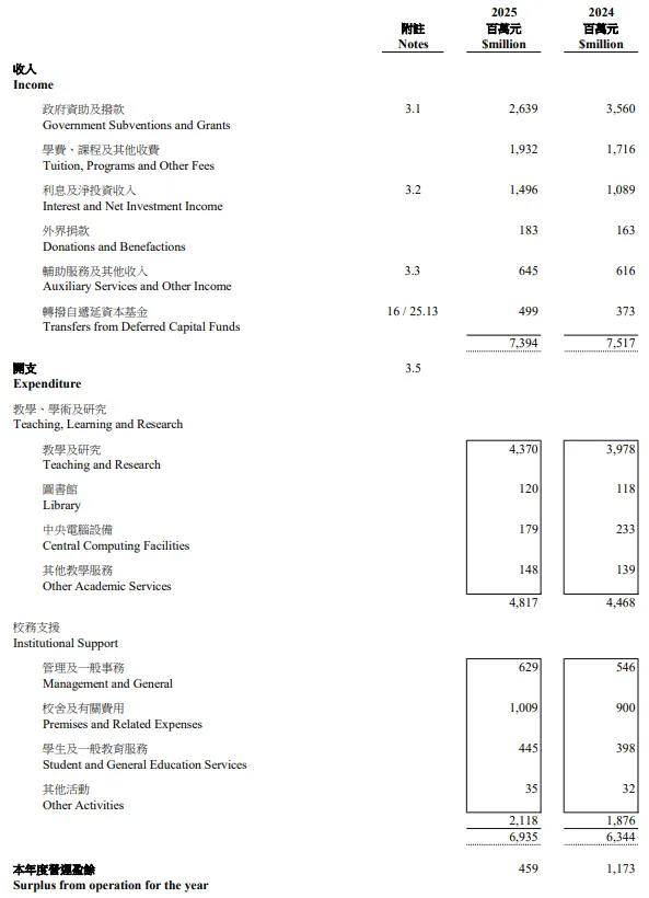 香港中文大学:年度盈余26.37亿港币,较上一学年的29.33亿略有回落,核心原因在于向政府退还10.41亿港币拨款储备。尽管主业收入略有调整,但港中文的“多元增收”成效显著——利息与投资净收益同比增加3.14亿,捐赠及捐款收入亦攀升3.24亿,凭借多元布局筑牢财政根基。