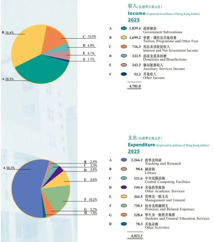 香港大学:表现最为亮眼,年度盈余达46.47亿港币,一举占据五校总盈余的近半份额。即便已向政府退还8.22亿港币拨款,仍较去年多赚8.59亿,盈利实力不容小觑。港大官方表示,收入增长得益于双重助力——学费稳步上调与投资业绩持续向好,让收入结构愈发多元均衡。与此同时,港大亦将巨额资金倾注于教育与科研领域,相关支出高达94.5亿港币,占总支出的主要部分。