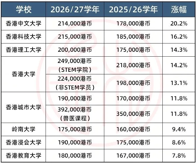 2024/2025学年,港八大非本地生本科 tuition 全部上涨,港大、港中文、港科大、港理工均突破20万港币/年,其中港中文涨幅超20%。