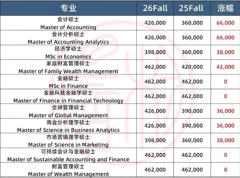 授课型硕士更是“涨势惊人”,以港大商学院为例,2026Fall多数专业学费突破40万港币,仅剩经济学、市场营销理学硕士勉强维持在39.8万,按照这个涨幅,明年可能再也看不到40万以下的港大商科硕士了。