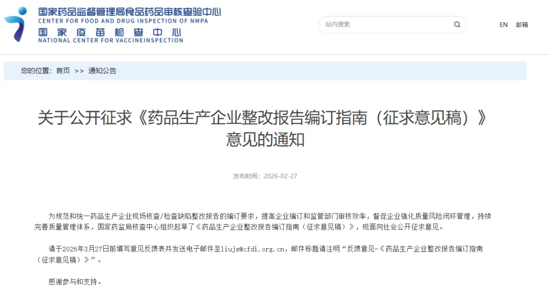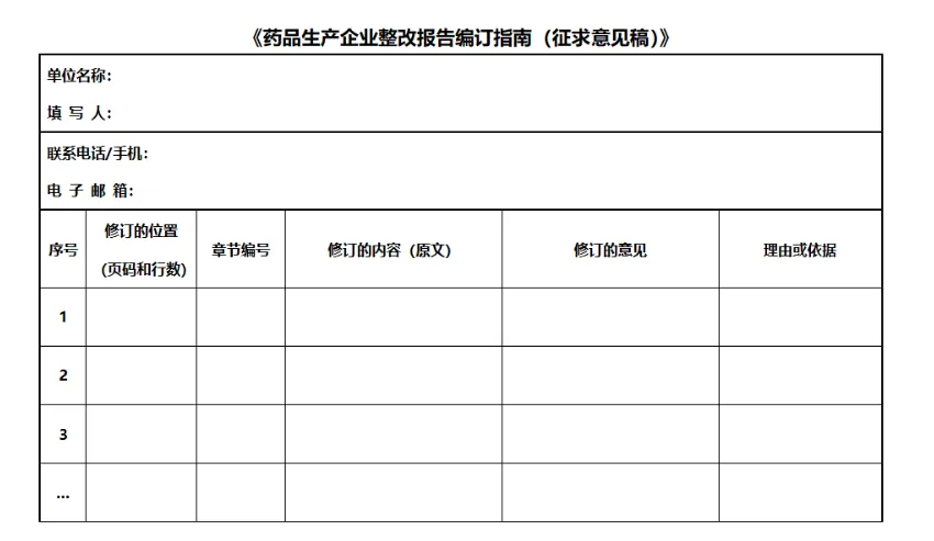请于2026年3月27日前填写意见反馈表并发送电子邮件至liujx@cfdi.org.cn,邮件标题请注明“反馈意见-《药品生产企业整改报告编订指南(征求意见稿)》”。