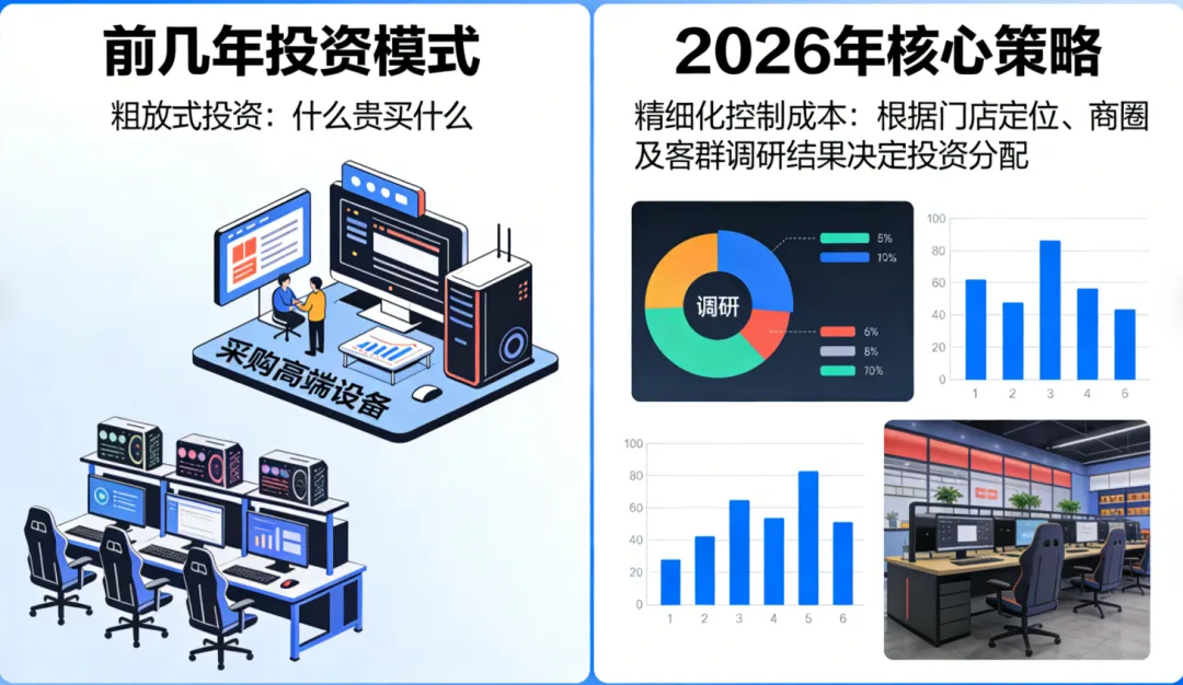 前几年网吧“什么贵买什么”的粗放式投资彻底失灵!26年的核心是精细化控制成本,根据门店定位,商圈及客群调研结果决定投资分配。