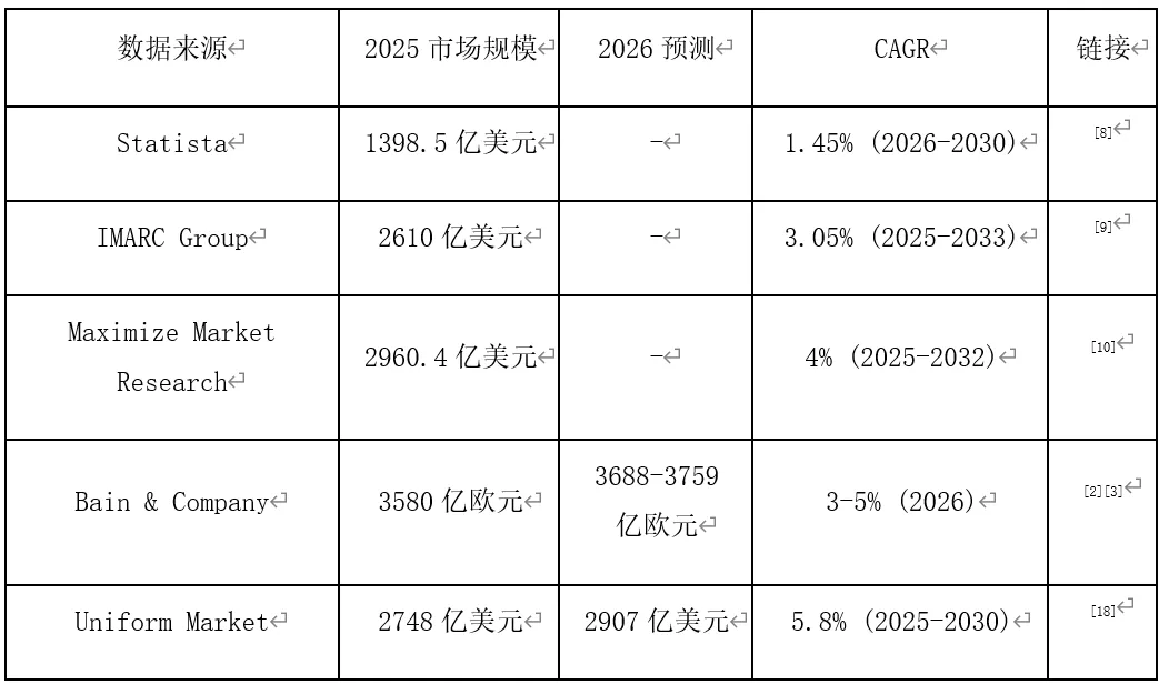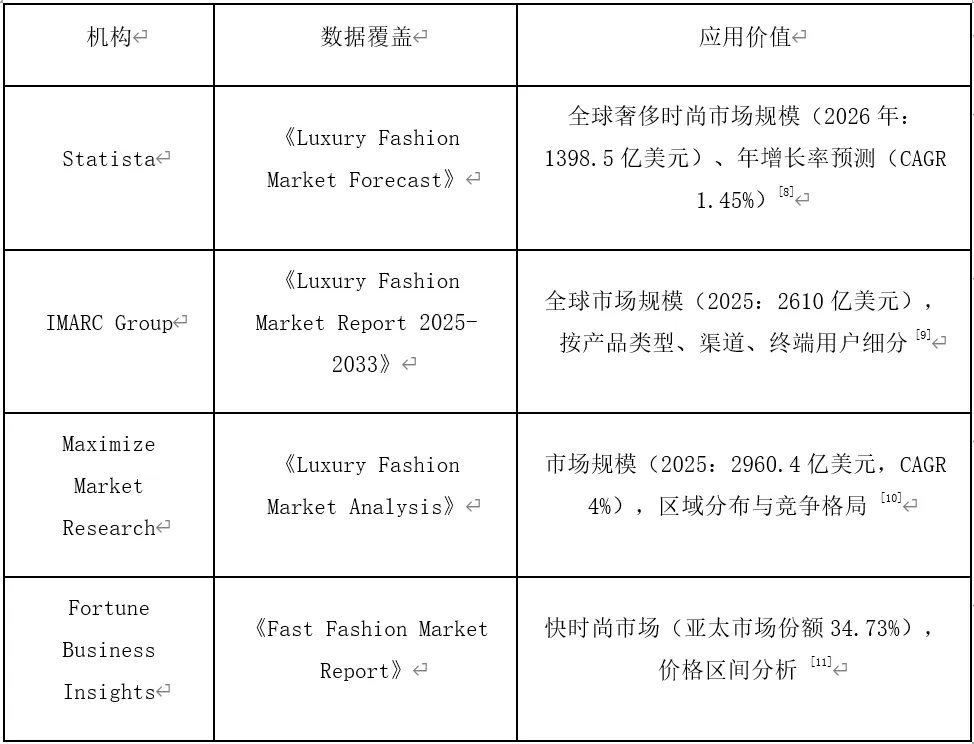 数据差异说明:不同机构定义的"奢侈时尚"范围不同。Statista聚焦高端成衣,Bain包含个人奢侈品全品类,IMARC涵盖wider luxury fashion定义。