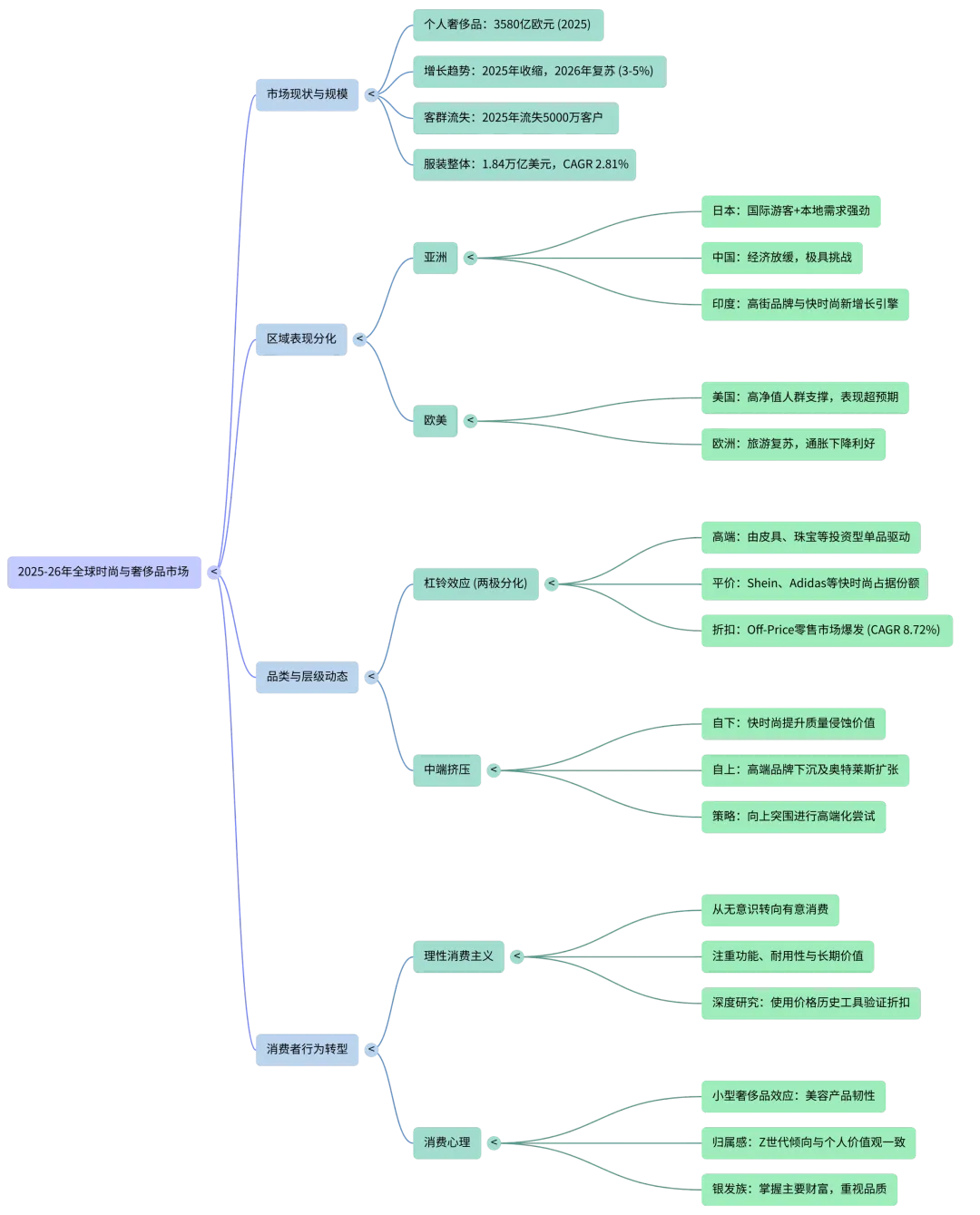 关键洞察:配饰类(皮具、珠宝)增长率显著高于成衣,反映了消费者偏好"投资型单品"(investment pieces)——既能彰显身份又具有保值属性的产品。