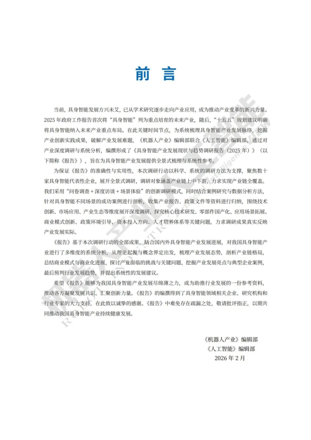 《具身智能行业产业发展现状与趋势调研报告(2025年)》由《机器人产业》与《人工智能》编辑部于2026年2月联合发布。报告旨在系统梳理具身智能产业发展脉络,通过“问卷调查+深度访谈+场景体验”等创新调研模式,对产业链代表性企业进行全景式调研,以期为产业发展提供全景式梳理与系统性参考。