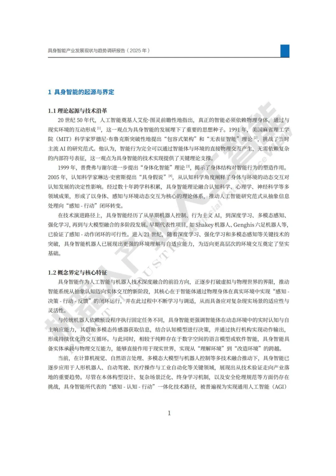 报告回顾了具身智能的理论起源与技术沿革,其思想可追溯至艾伦·图灵,并由罗德尼·布鲁克斯等人的理论奠基。核心概念在于智能体通过物理身体,在真实环境中实现“感知-决策-行动-反馈”的闭环,强调与环境的动态交互和实时响应能力,被视为实现通用人工智能(AGI)的关键阶梯。