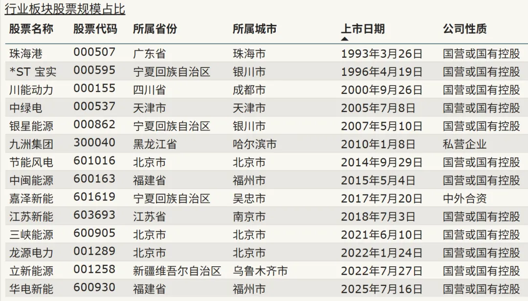 该行业总市值最大的个股是华电新能 (600930),截止至2025Q3季度的总市值为2,715.60亿元;总市值最小的个股是九洲集团 (300040),总市值为44.67亿元。