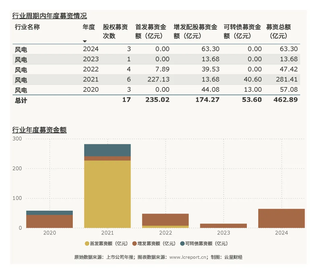 以五年为周期(指从2020Q4-2025Q3,下同),风电板块共发生股权融资事件17起,累计募资463亿元,资本运作较为活跃,成为推动行业规模扩张的重要动力。