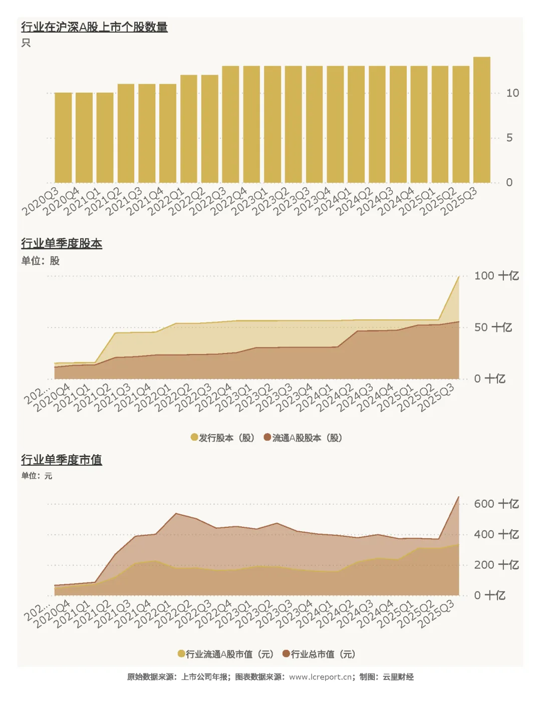 截止至2025Q3季度,风电行业[2]共有沪深A股上市公司[3]14家,流通A股的股本为553.31亿股,流通市值为3,328.48亿元。
