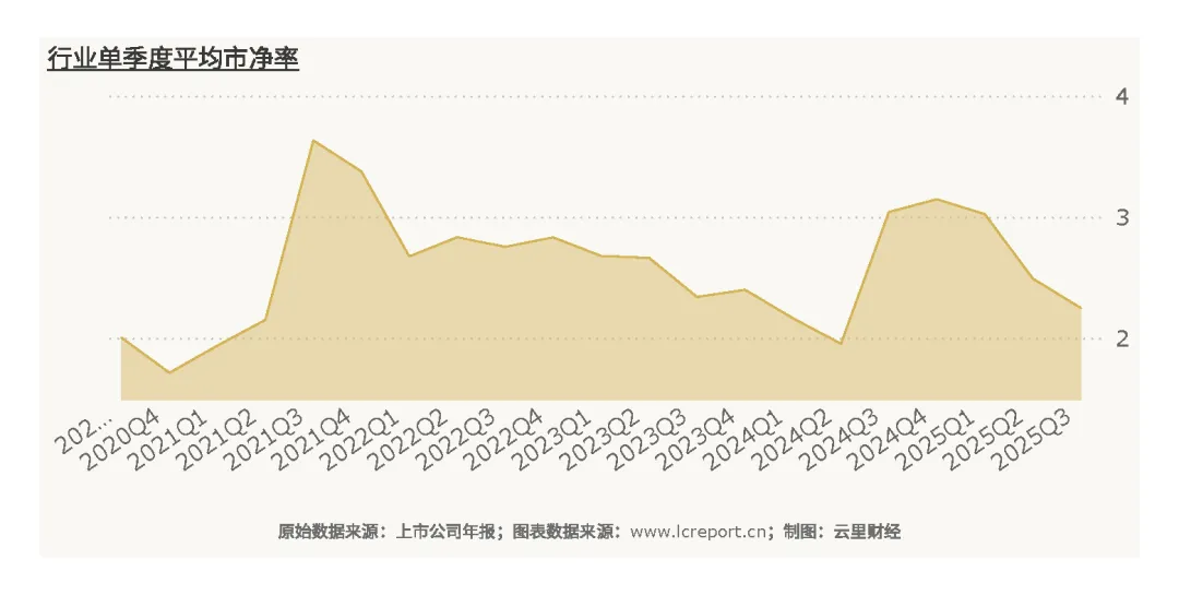 风电业在2025Q3季度的整体市净率[4]为2.25倍,而历史最高市净率为10.19倍,历史平均市净率为3.24倍。整体市净率显著低于历史平均水平,且远低于历史最高值,行业整体估值处于历史低位,估值修复具备一定空间。