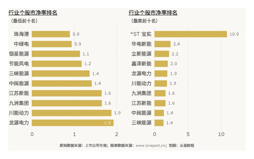 该板块当季共有破净股[5]2只,扣除市净率为负值的个股外,市净率最小的个股是*ST 宝实(000155),市净率为0.90倍;而市净率最大的是*ST 宝实(000595),当季市净率为10.88倍——排除ST股,估值最高的为华电新能,市净率也仅2.4倍。整体而言,板块内个股估值相对均衡,并处于较低水平。