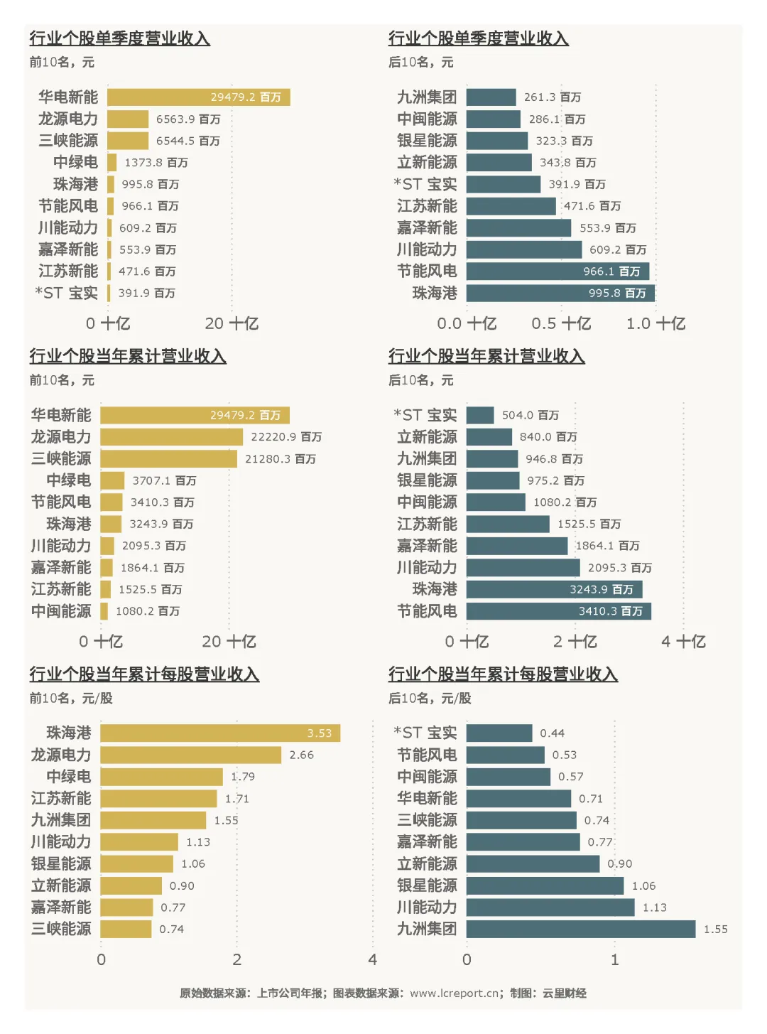 个股单季度营收最大值为华电新能(600930)的294.79亿元,单季度营收最小值为九洲集团(300040)的2.61亿元,单季度平均营收为35.12亿元;今年前3个季度,累计营收最大值为华电新能(600930)的294.79亿元,累计营收最小值为*ST 宝实(000595)的5.04亿元;单季度每股营收最大值为珠海港(000507)的1.08元/股,每股营收最小值为节能风电(601016)的0.15元/股。