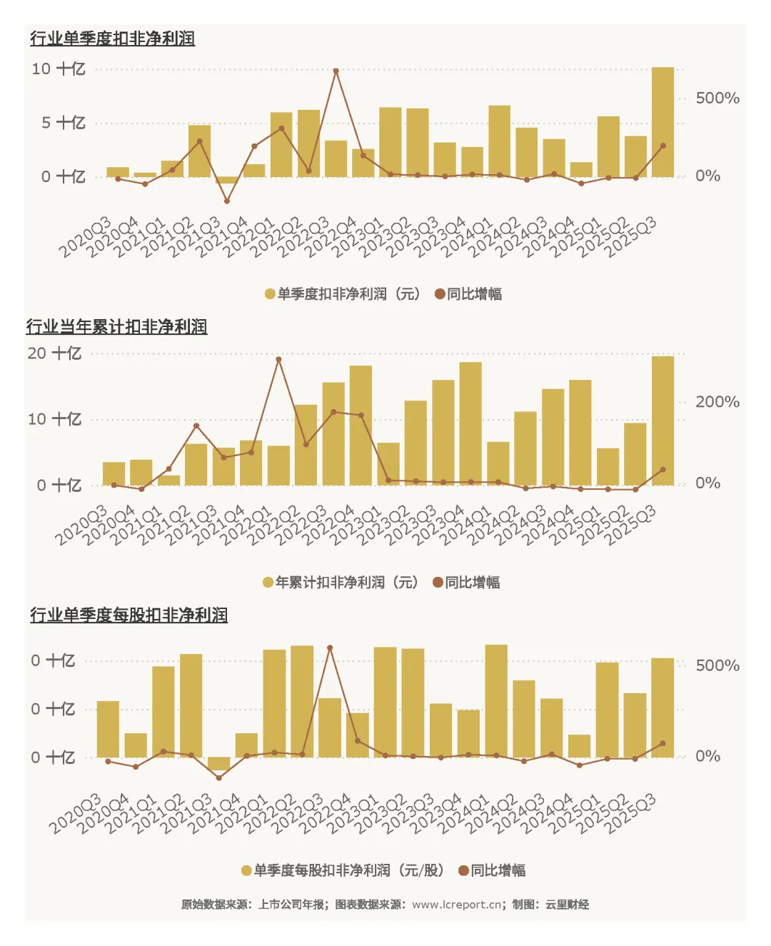 风电业在2025Q3季度总实现扣非净利润为101.21亿元、同比增长192.31%,今年前3个季度累计实现扣非净利润194.88亿元,同比增长33.60%;当季每股扣非净利润为0.10元,同比增长68.98%,行业盈利增长动力强劲。