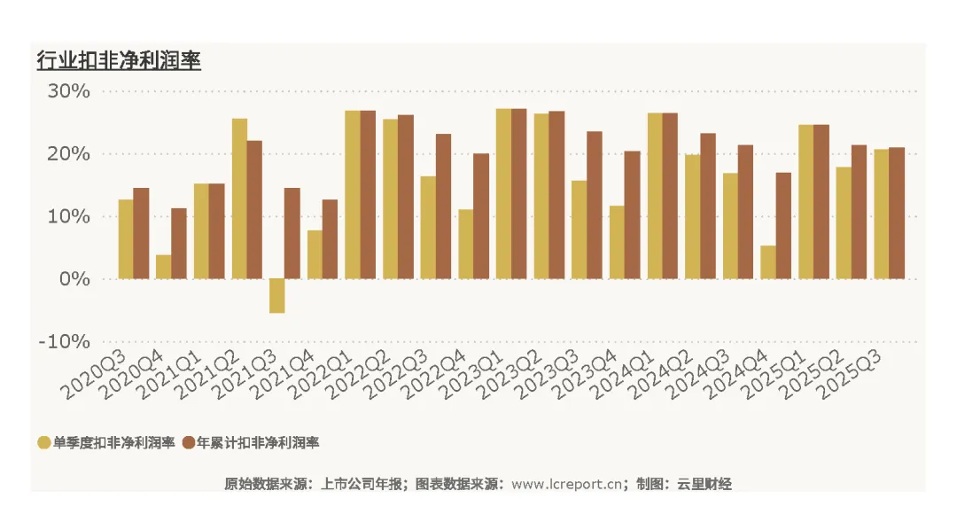 2025Q3季度风电业的当季平均扣非净利润率为20.59 %,前3个季度累计扣非净利润率为20.92%,行业整体盈利质量较高,营收转化为净利润的能力较强,且盈利效率保持稳定。
