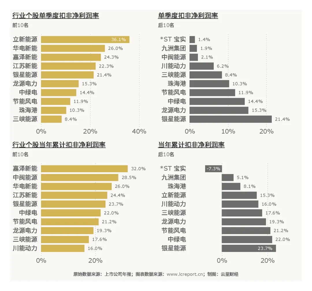 当季扣非净利润最大值为华电新能(600930)的76.68亿元,当季扣非净利润最小值为九洲集团(300040)的0.05亿元(负值为亏损),该行业当季平均扣非净利润为7.23亿元;当年累计扣非净利润最大值为华电新能(600930)的76.68亿元,累计扣非净利润最小值为*ST 宝实(000595)的-0.37亿元(负值为亏损);前3个季度,累计每股扣非净利润最大值为龙源电力(001289)的0.51元/股,累计每股扣非净利润最小值为*ST 宝实(001289)的-0.03元/股(负值为亏损)。