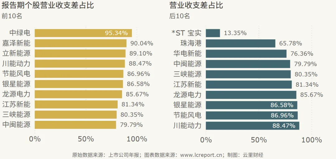 个股中,以营业收支差占利润总额比例为标准,主营业务盈利能力最强的个股是中绿电(000537),营业收支差占利润总额比例达到95.34%;主营业务盈利能力相对最弱的个股是*ST 宝实(000595),营业收支差占比仅13.35 %;而九洲集团(300040)的营业收支差为-8,507,325.00,主营业务录得亏损。个股主营业务盈利能力分化显著,部分标的核心经营能力偏弱,盈利的可持续性存疑。