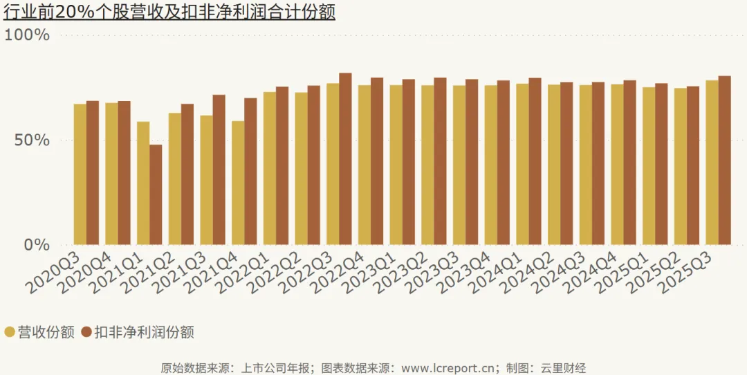 以年累计营业收入为标准,风电业前20%的上市公司在2025Q3季度的累计份额为78.33%;以年累计扣非净利润为标准,前20%的上市公司的累计份额为80.45%,行业集中度处于较高水平。这一特征反映风电行业已进入成熟发展阶段,头部企业凭借技术、规模、资源等竞争优势,在市场份额和利润获取上占据绝对主导地位,行业马太效应凸显。