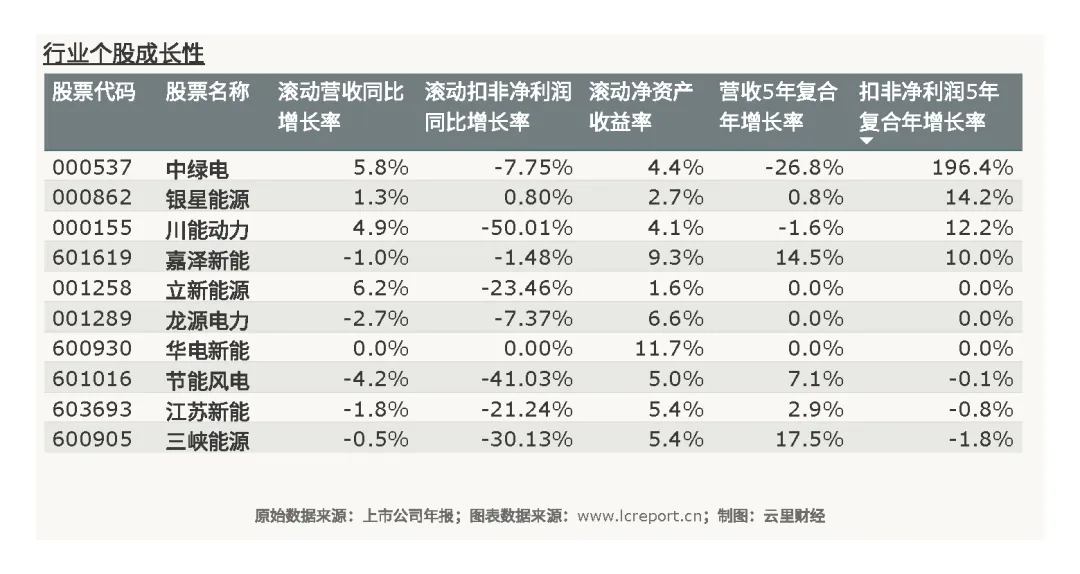 行业集中度持续提升,A股板块前20%上市公司以累计营收78.33%、累计扣非净利润80.45%的份额占据主导,头部企业(如华电新能总市值2715.60亿元)凭借规模、技术与资源优势强化马太效应,与全球风电行业“头部集聚”趋势一致。个股成长性分化明显:中绿电(000537)扣非净利润五年复合增长率达196.36%,而部分中小企业因经营效率不足呈现负增长。