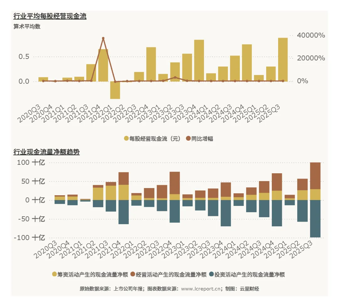 2025Q3季度风电业实现平均每股经营现金流0.87元,整体经营现金流表现稳健,行业上市公司通过主营业务获取现金的能力良好,行业整体现金流风险较低。