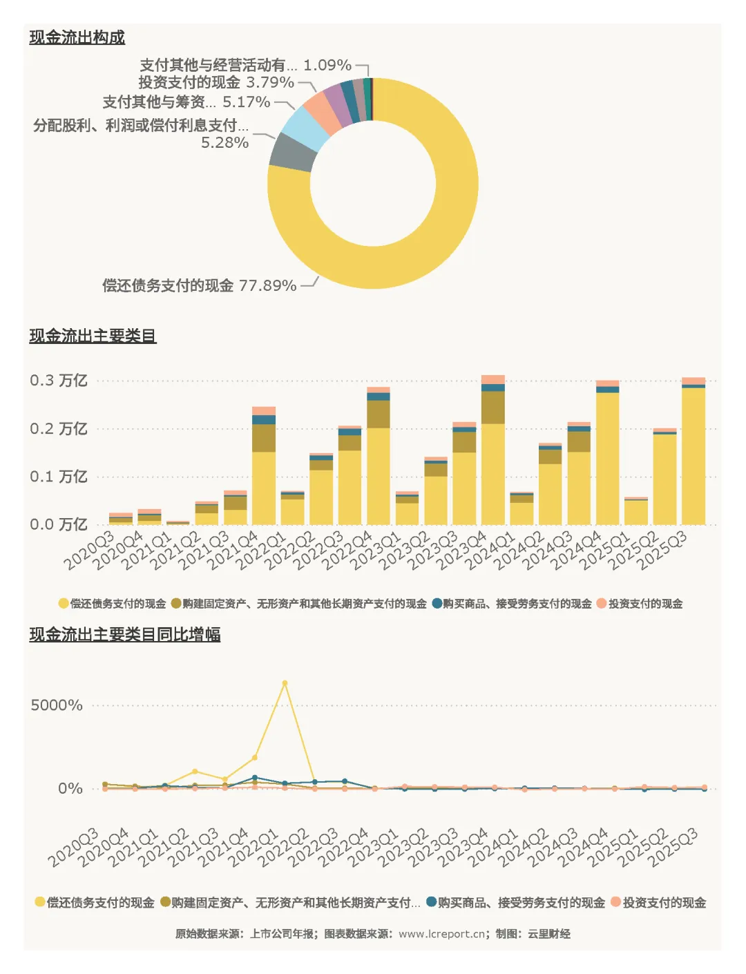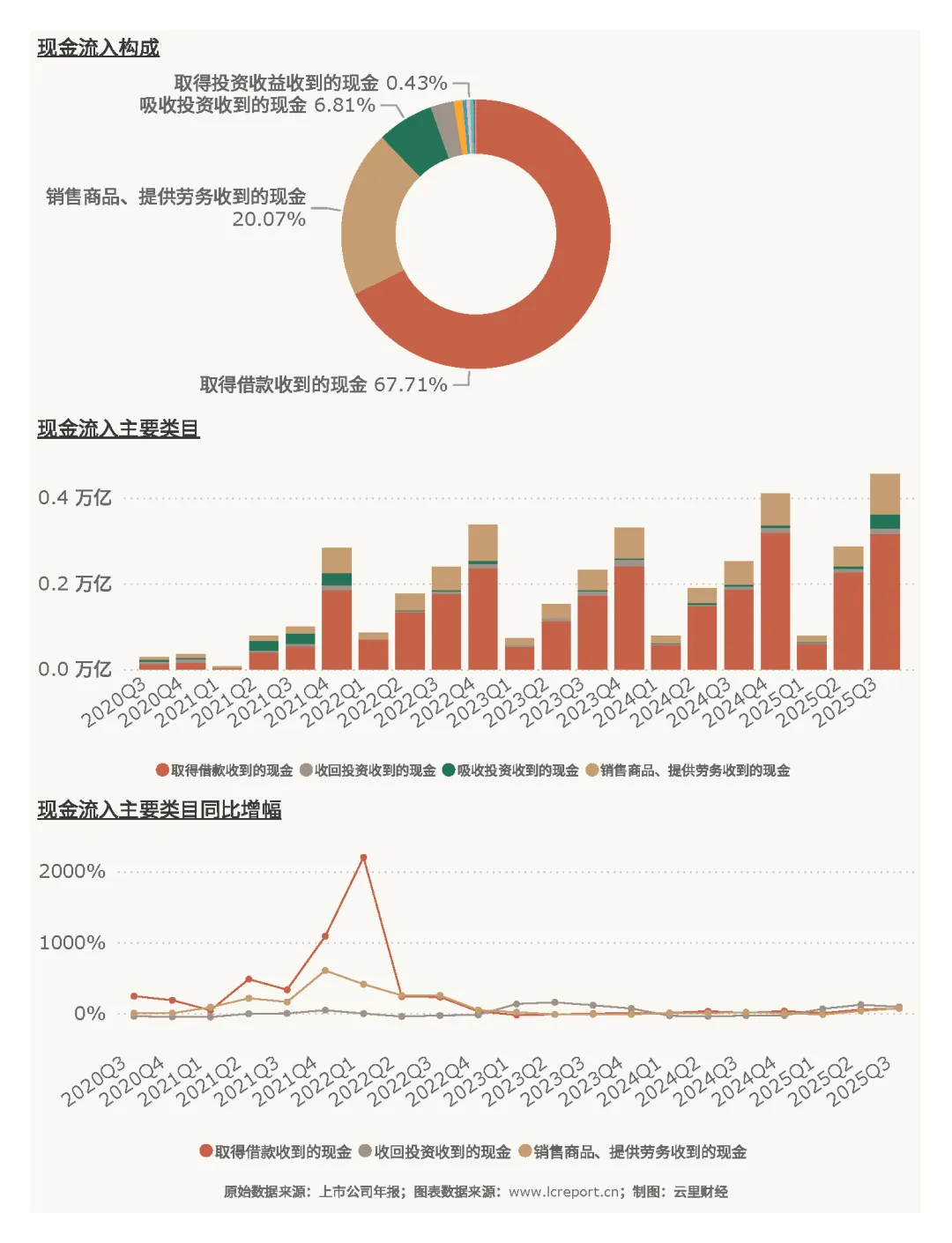 2025Q3 季度风电行业现金流入结构呈现明显的债务融资导向,其中取得借款收到的现金占比 67.71%,为现金流入的最主要来源,体现风电行业重资产、高投资的属性,企业经营和项目扩张高度依赖银行借款等债务融资。