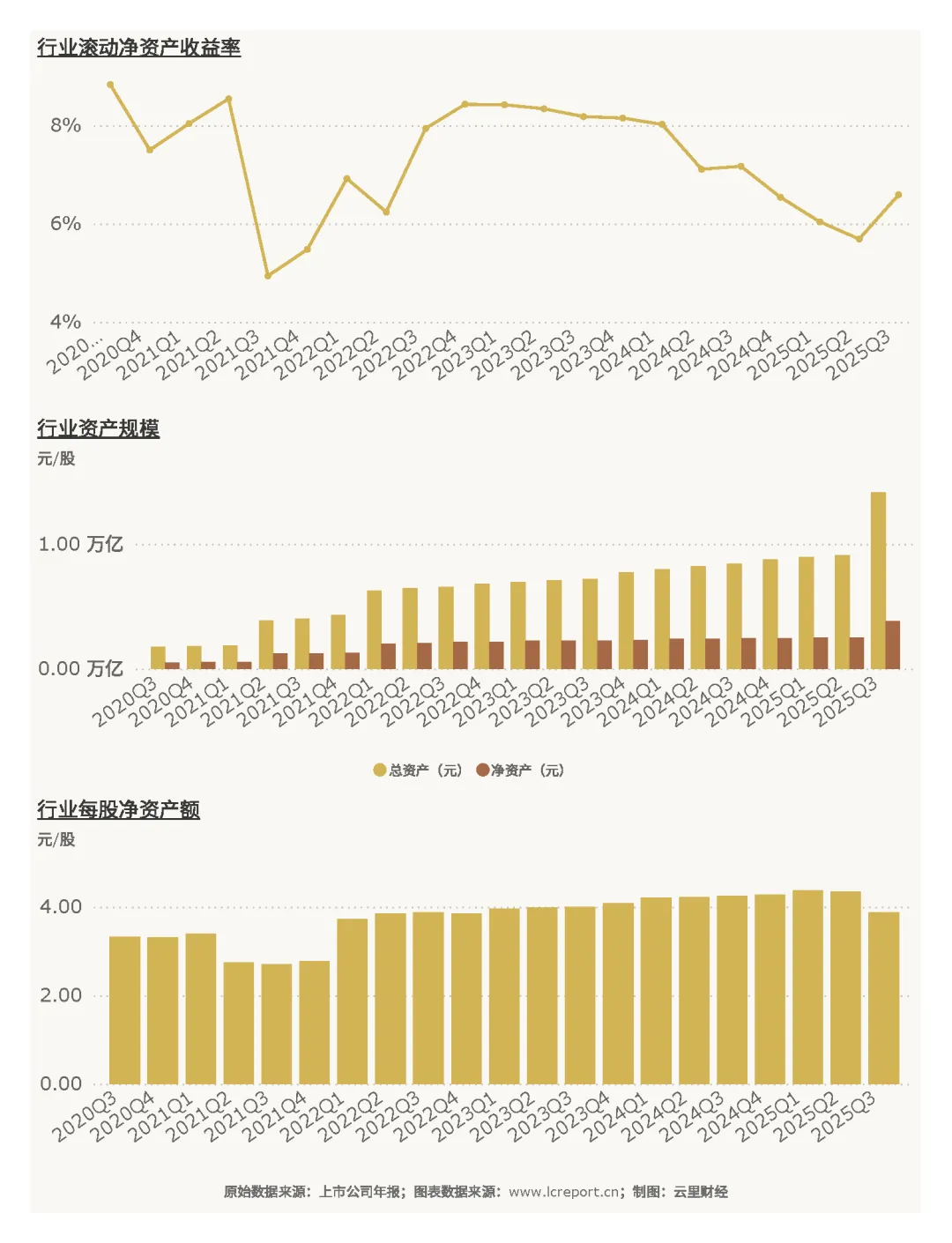 2025Q3季度风电业的总资产达到14,142.13亿元,净资产为3,831.42亿元,同比增幅为54.28 %,每股净资产为3.88元/股,滚动净资产收益率为6.59 %。行业资产规模扩张显著,资产实力不断提升,资产盈利效率尚可,具备一定的投资回报能力。